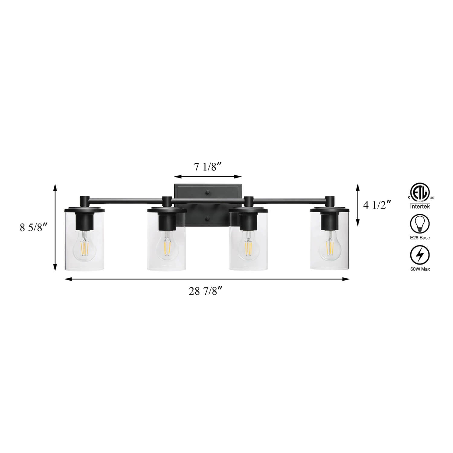 - MEDIUM BASE SOCKET: This black vanity light suggest to takes four maximum 60 watt Medium base bulbs (incandescent, or LED compatible). Bulbs not included.