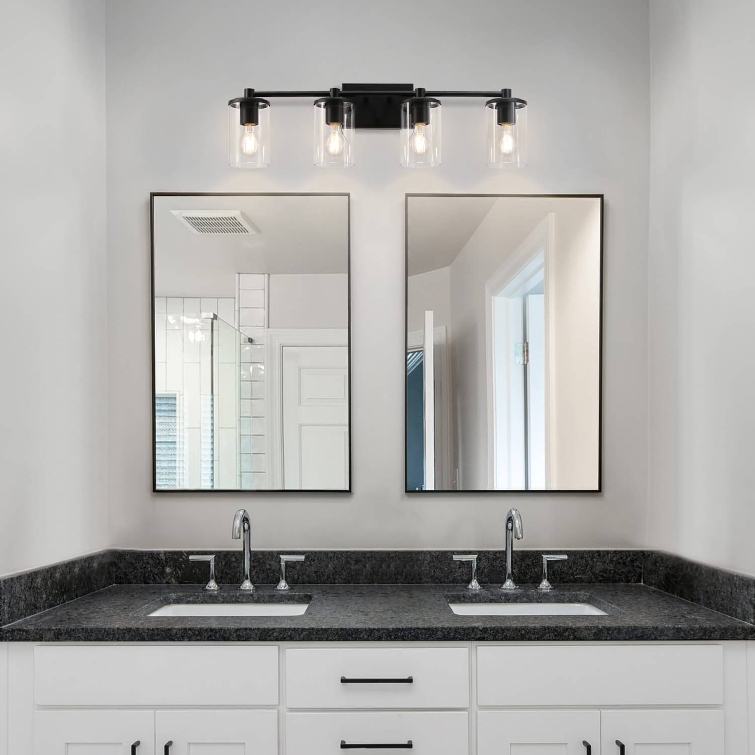 Love this vanity light. It's perfect for a double vanity with a 48" mirror. The globes are absolutely clear and perfect for Edison bulbs. We have a black and white bathroom and this is the perfect addition. It was difficult to find a modern-farm house four-light fixture locally, I'm glad we got this one. Easy to clean.