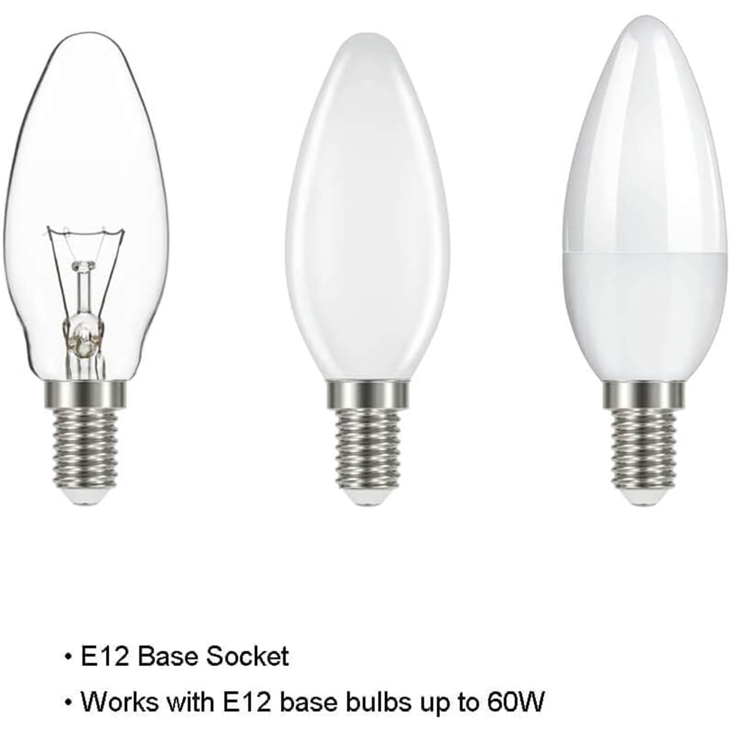 • E12 BASE SOCKET: Suggest to takes one maximum 60 watt E12 base bulbs (incandescent, CFL or LED compatible). Bulbs not included.