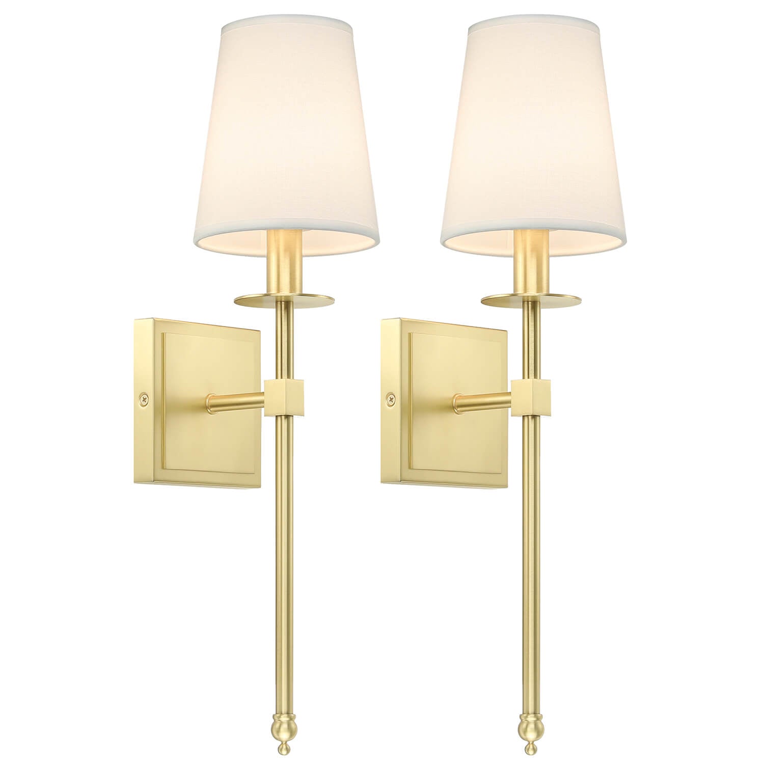 • FEATURE: Hardwired. 1 light single bedroom wall sconce light features a square satin brass finished back plate, a flared shape white fabric shade,a straight long arm and a decor knob at the bottom.The fabric shade gives you a comfy feeling with its soft light and perfect for lighting general areas. This wall lamp with fabric shade is set of 2 just mounted vertical only.