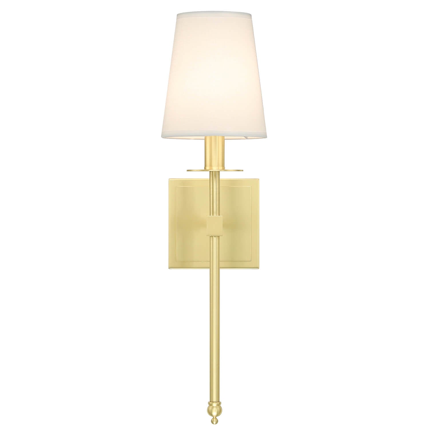 This brass wall lamp with durable metal long lamp body in satin brass finish and white fabric shade can perfectly match your home style.