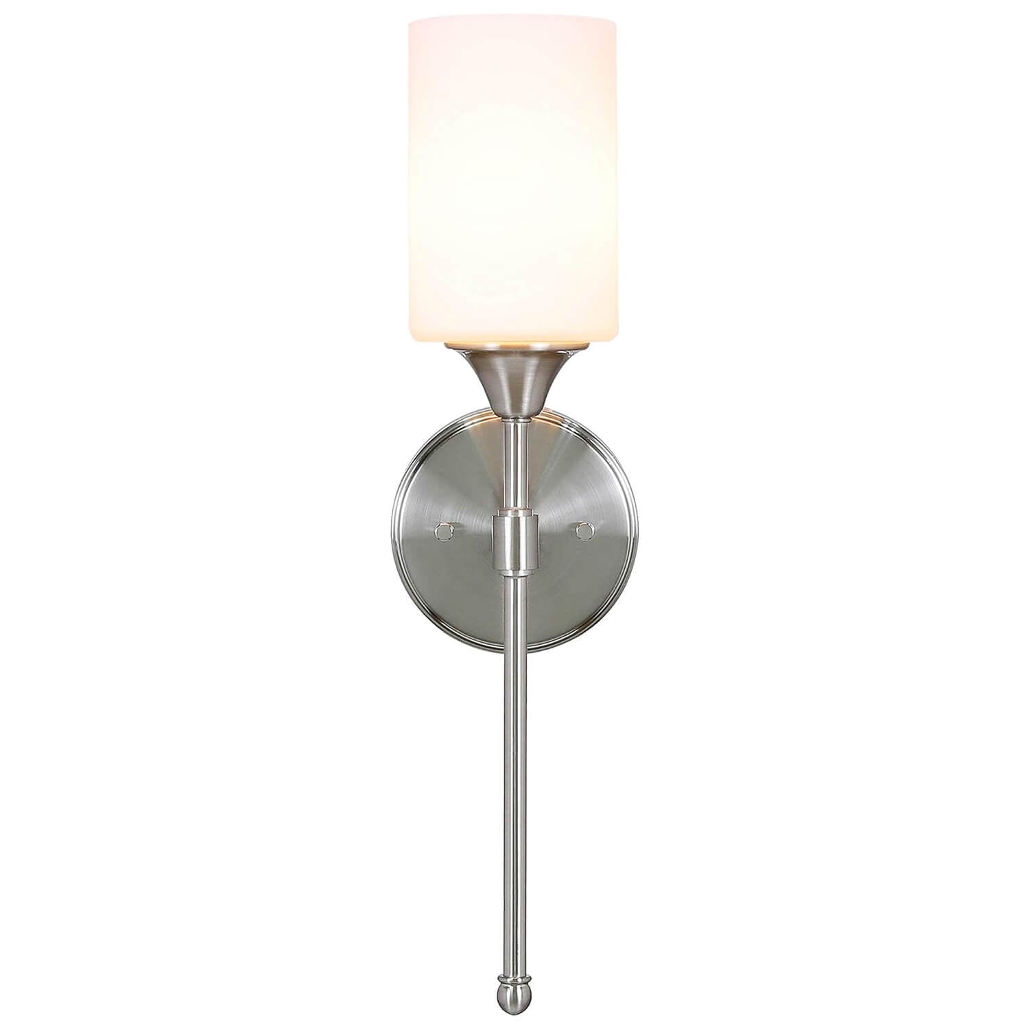 Wall sconce with metal construction in brushed nickel finish and white glass shade