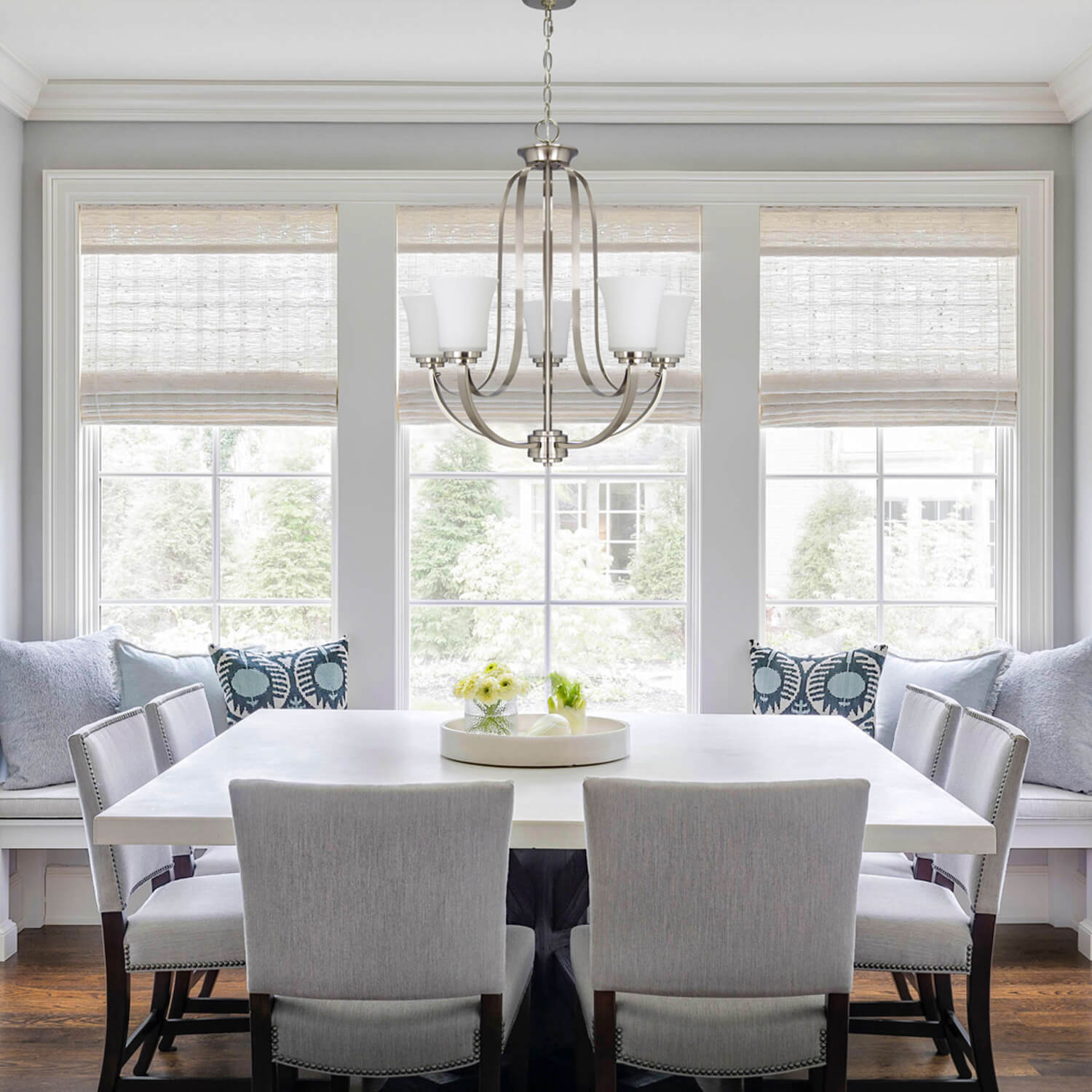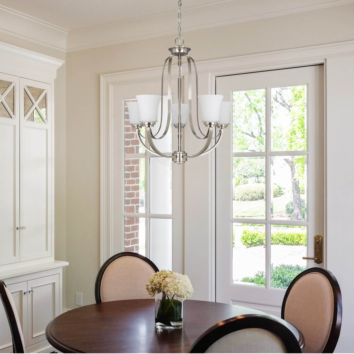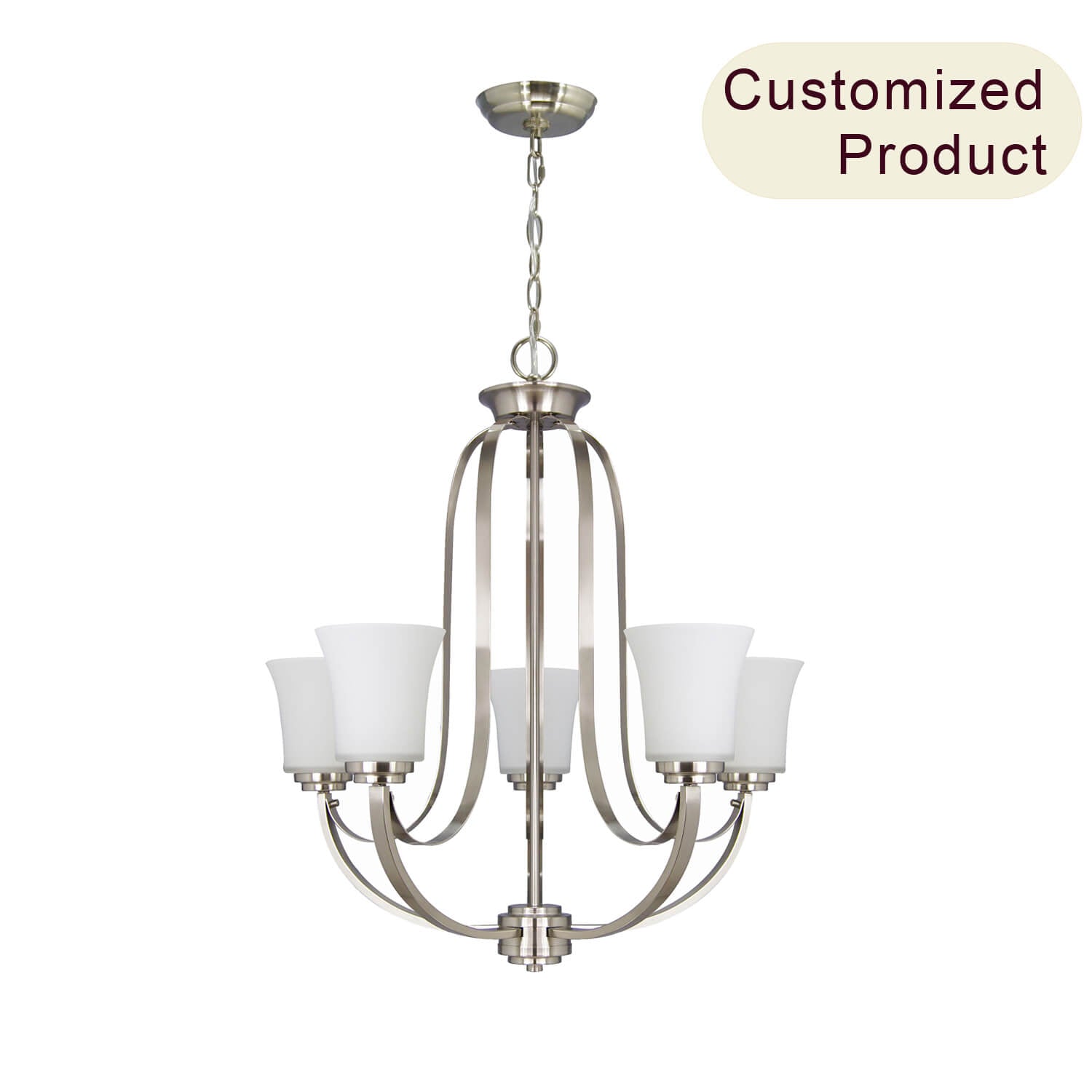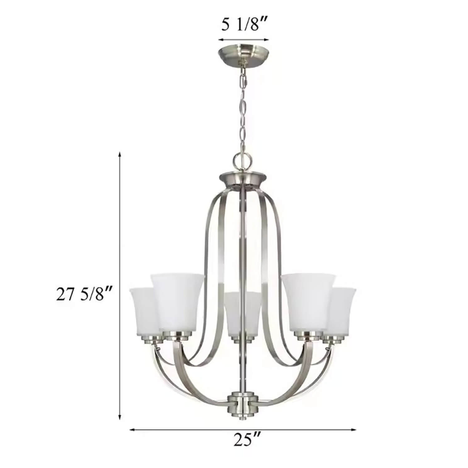 2. Featuring a brushed nickel finish and white glass shade and with chain to allow a variety of hanging heights, allows you to customize the fixture to your lighting needs and desired look.