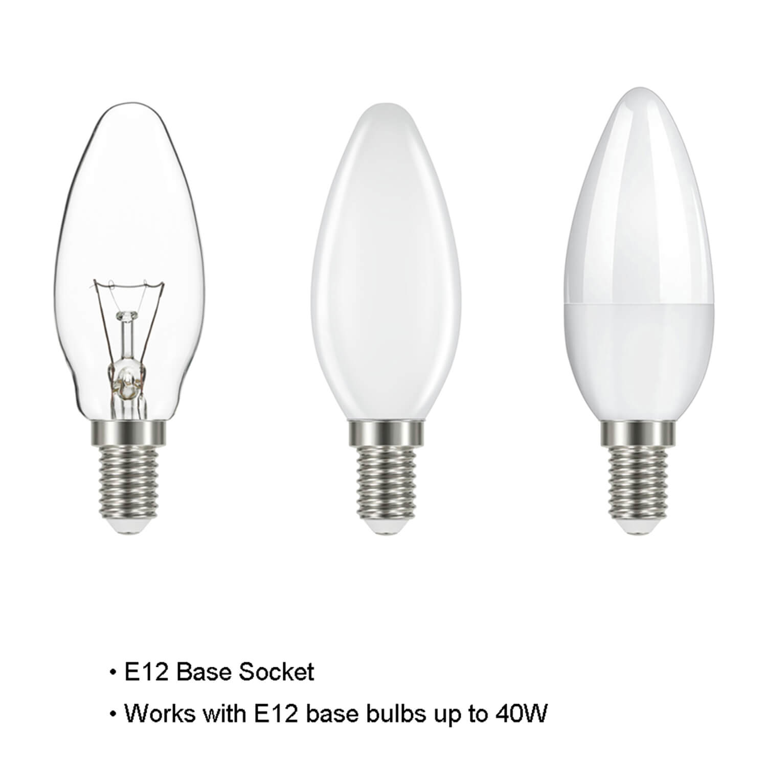 - E12 BASE SOCKET: Suggest to takes one maximum 60 watt E12 base bulbs (incandescent, CFL or LED compatible). Bulbs not included.