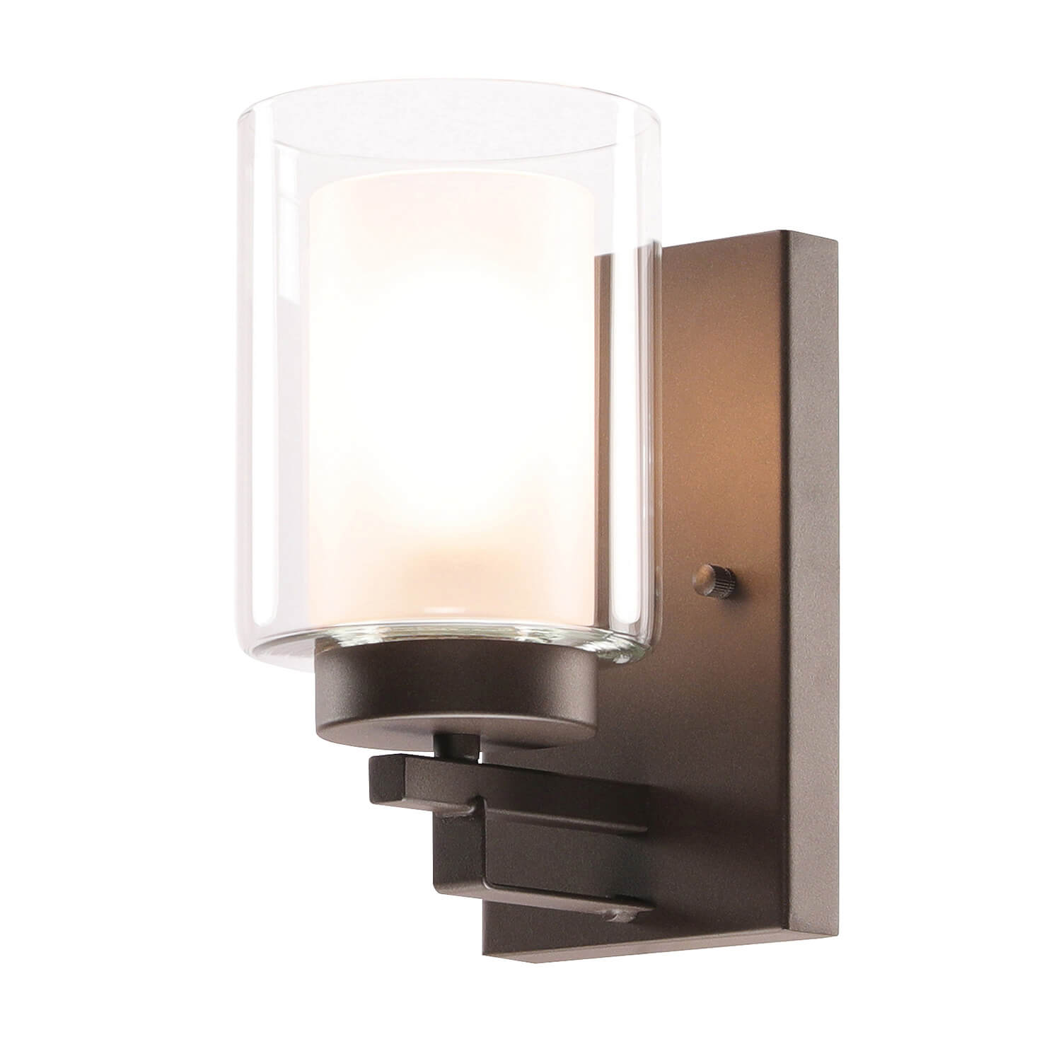 This 1 Light Wall light fixture is a hardwired product, that features dual shade (outer clear glass and inner frosted glass), minimal detailing, and in dark bronze finish.