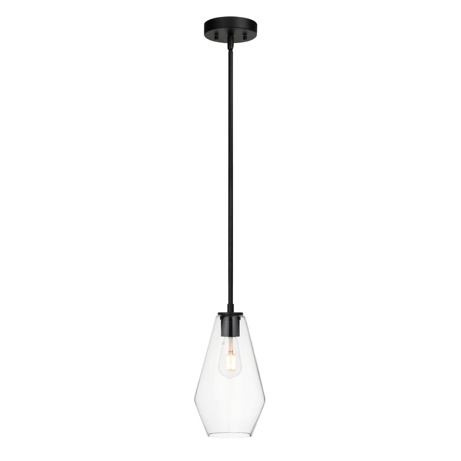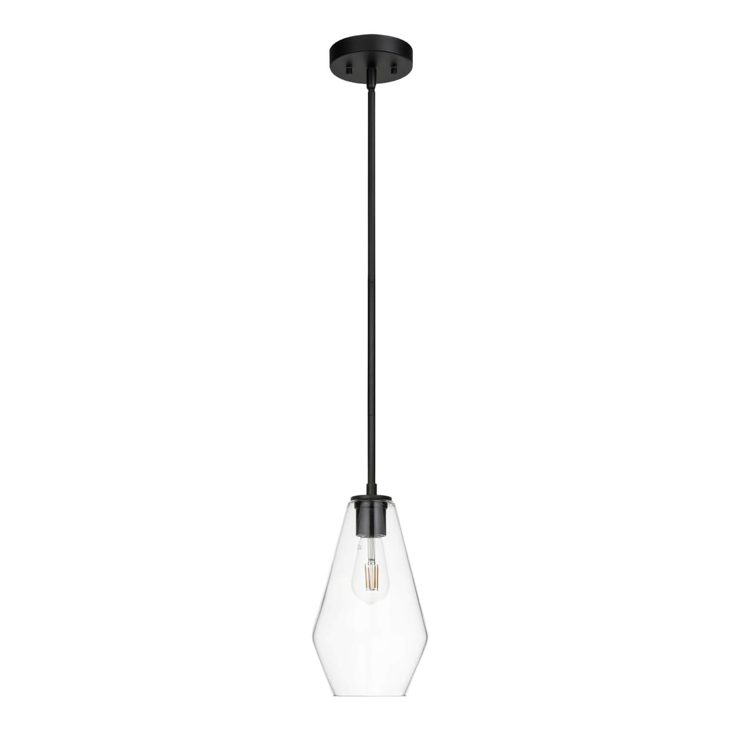 A matte black metal finish and bell shape clear glass shade completes the look that complements a variety of home décor.