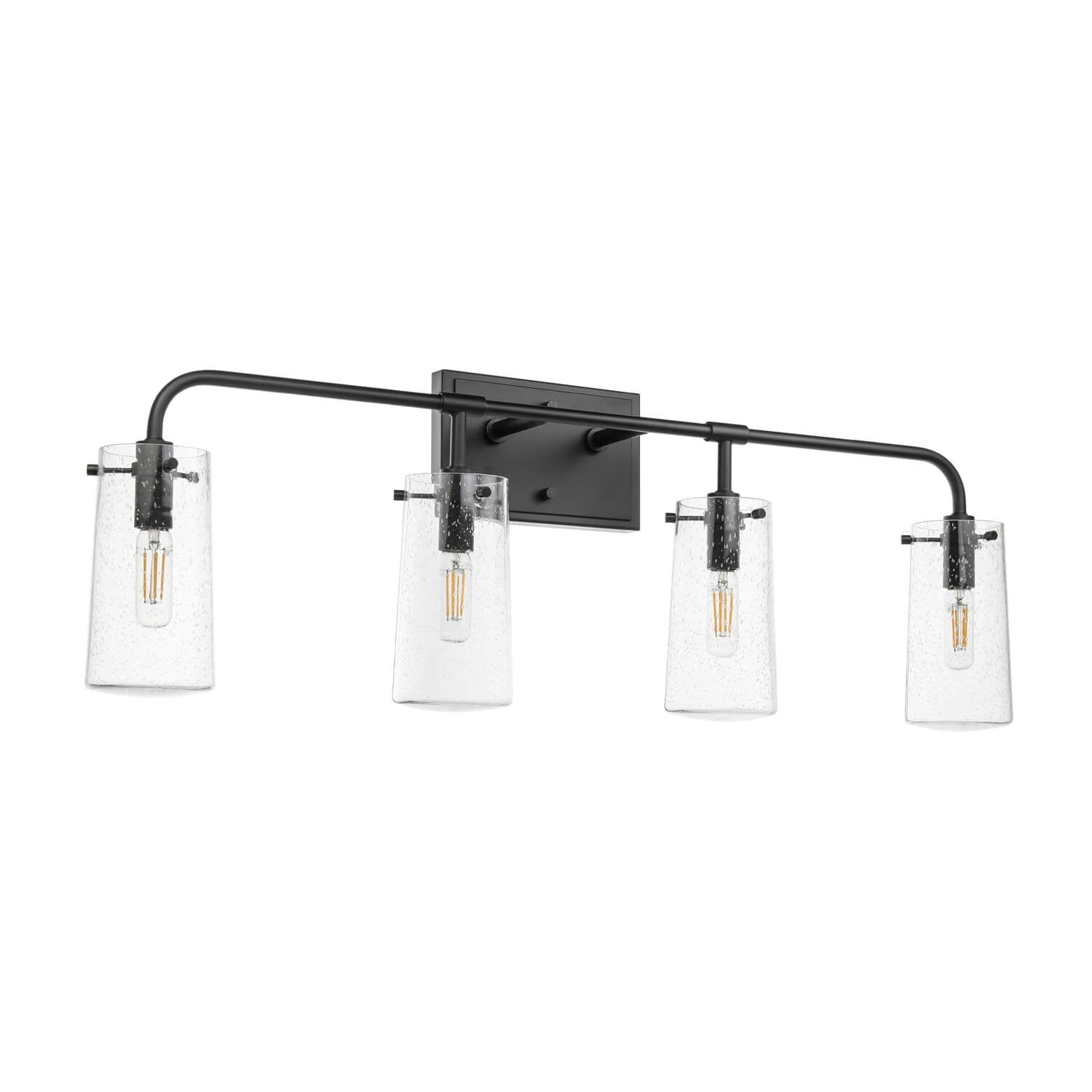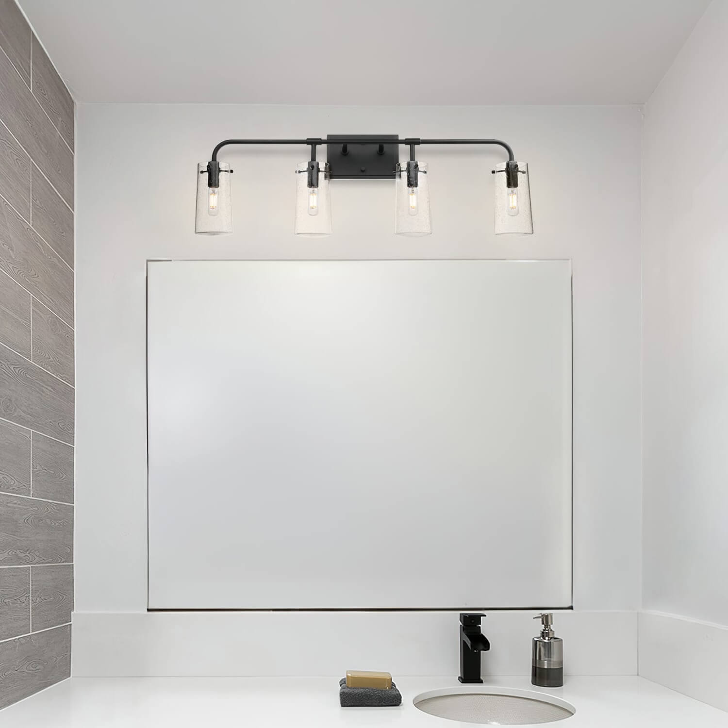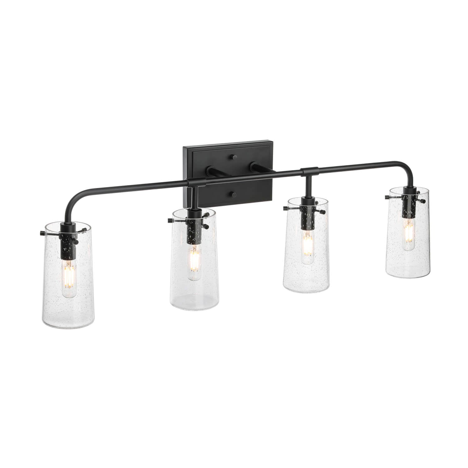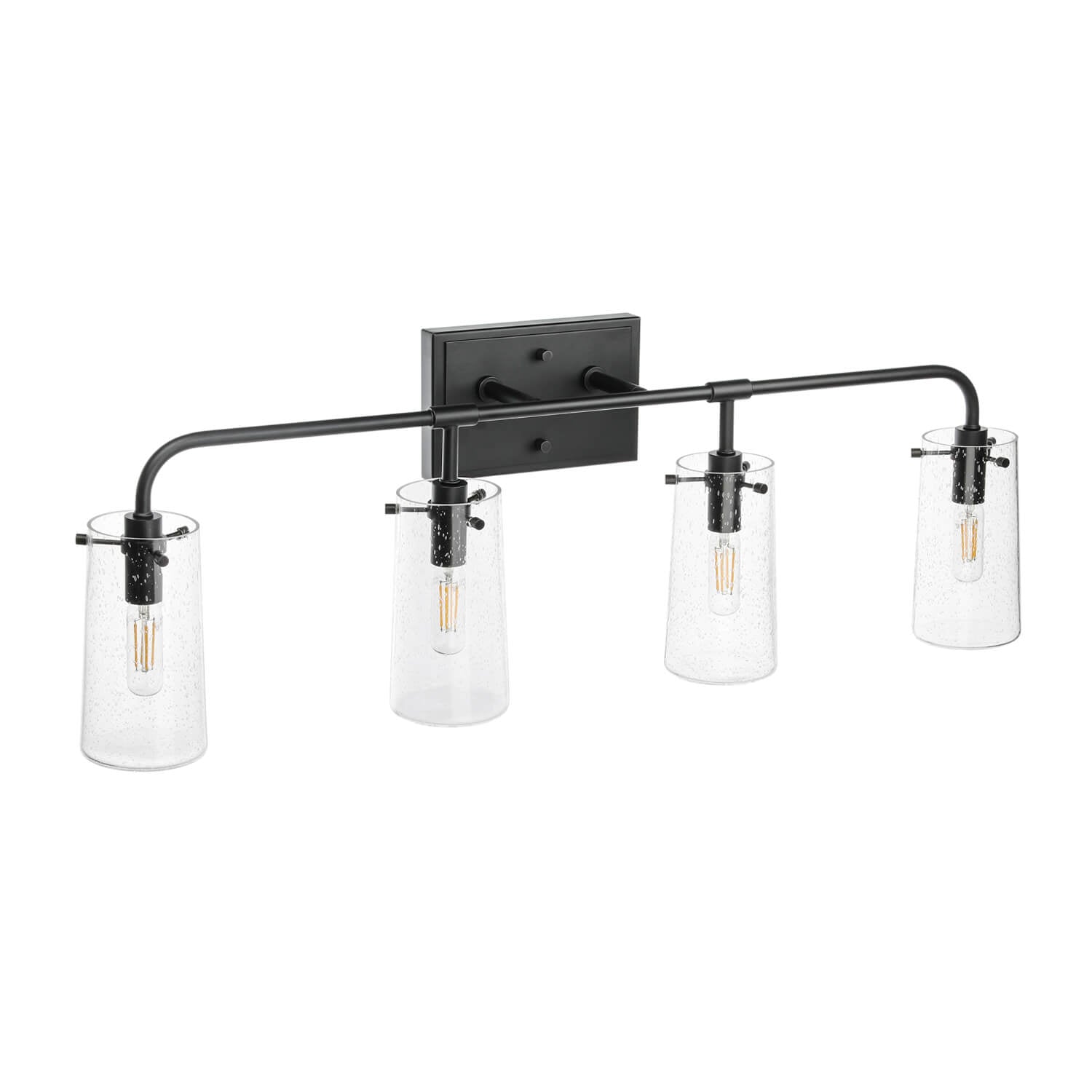 - INDUSTRIAL DESIGN: This bathroom vanity light features a industrial retro style with matte black finish and jar shade seeded glass shade. This 4 light vanity light create a warm and soft atmosphere and highlight your unique taste.