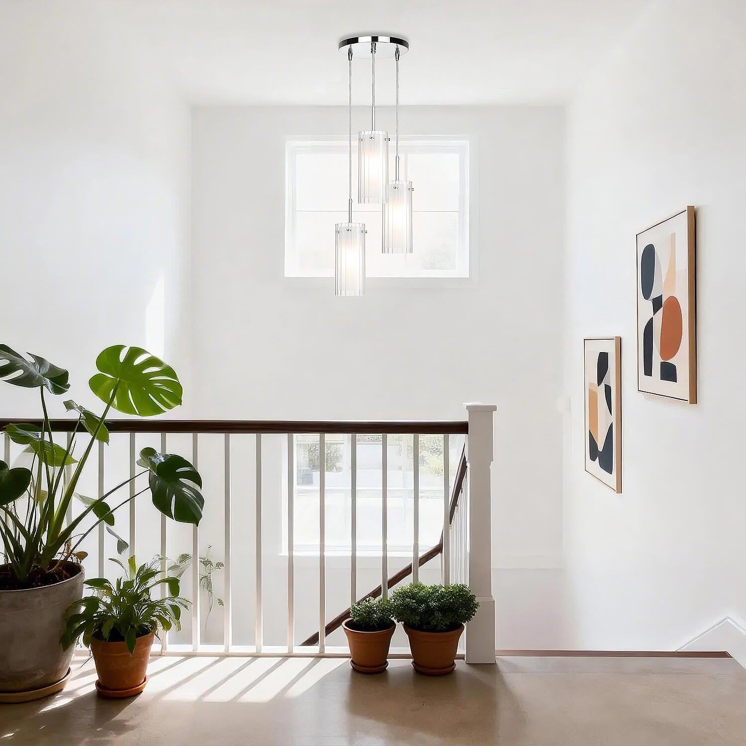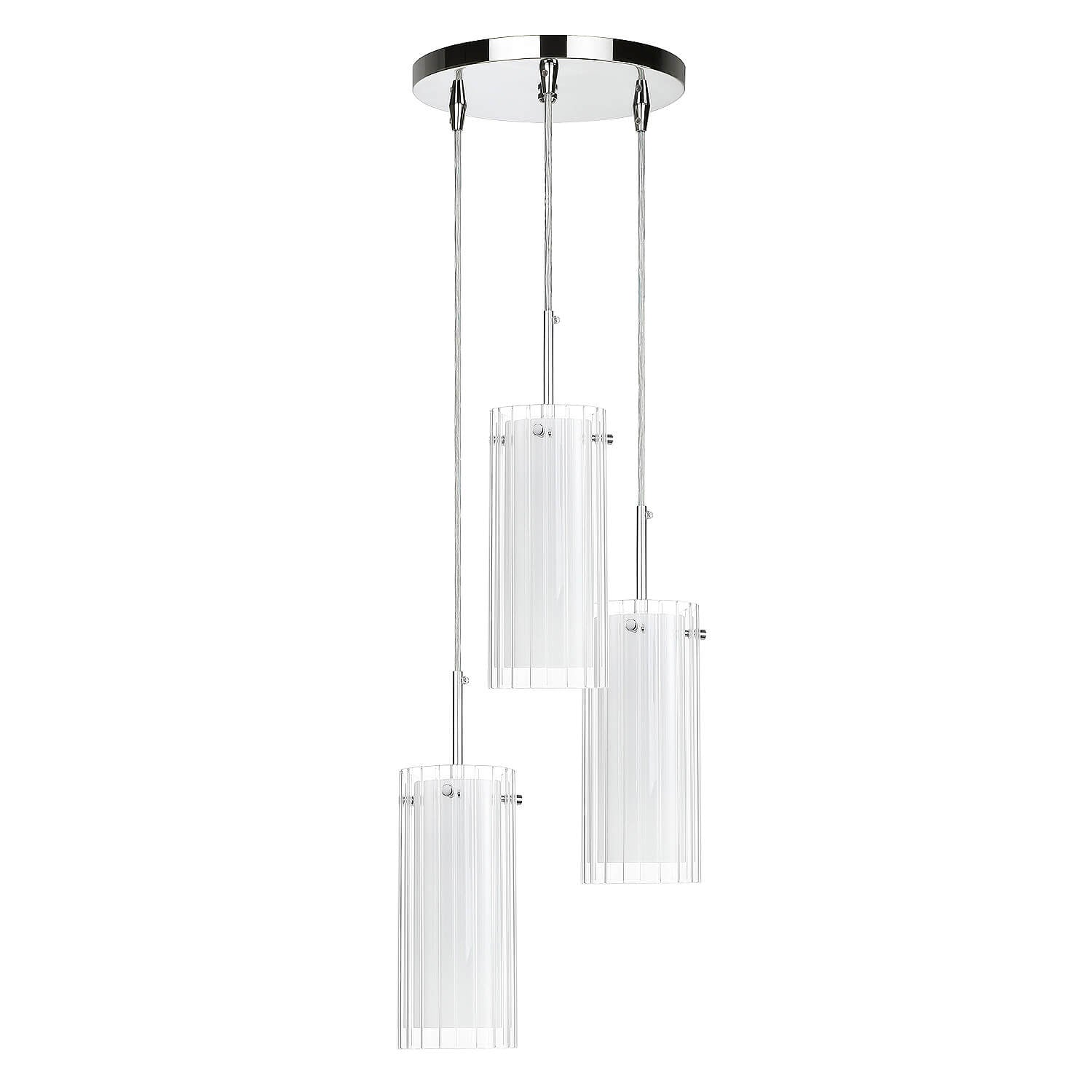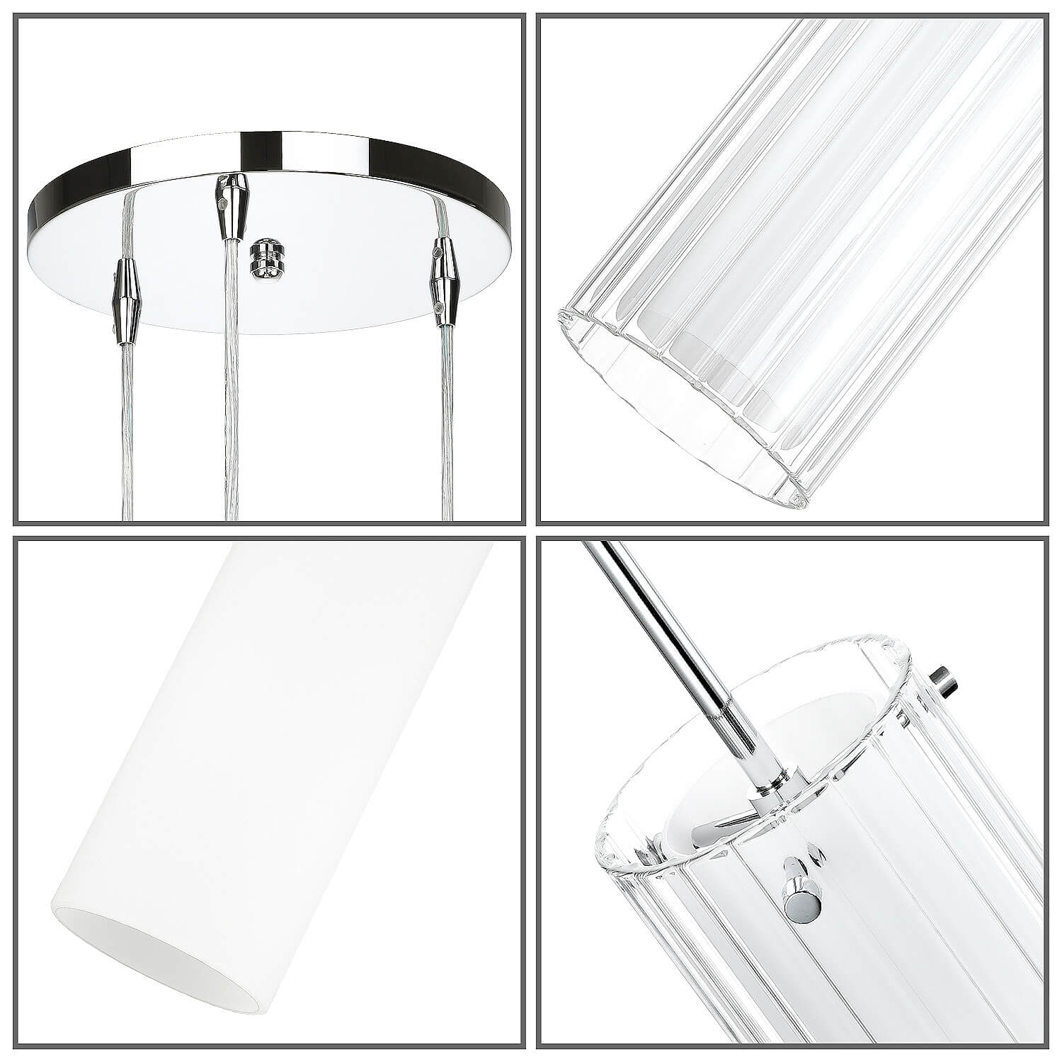 - Featured: 3 light pendant light fixture in chrome finish and unique dual glass design with an inner white glass and an outer ribbed glass shade. Cluster pendant lights create a stylish and elegant atmosphere that enhances any room. This modern glass pendant light is ideal for use in your kitchen, dining room, bedroom, interior hallway, bar, or coffee shop.