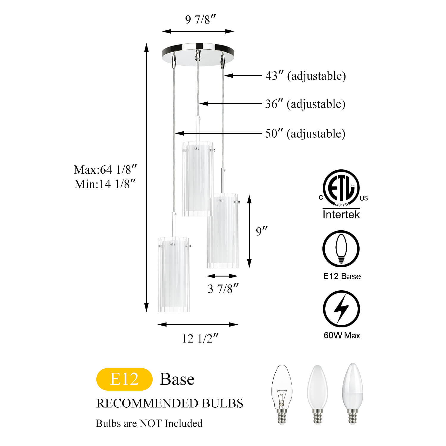 - E12 CANDELABRA BASE SOCKET: Chrome pendant lighting suggest to take three maximum 60 watt E12 base bulbs (incandescent, CFL or LED compatible). Fully dimmable when using dimmable bulb and dimmer switch (Bulb & Switch Not Included).