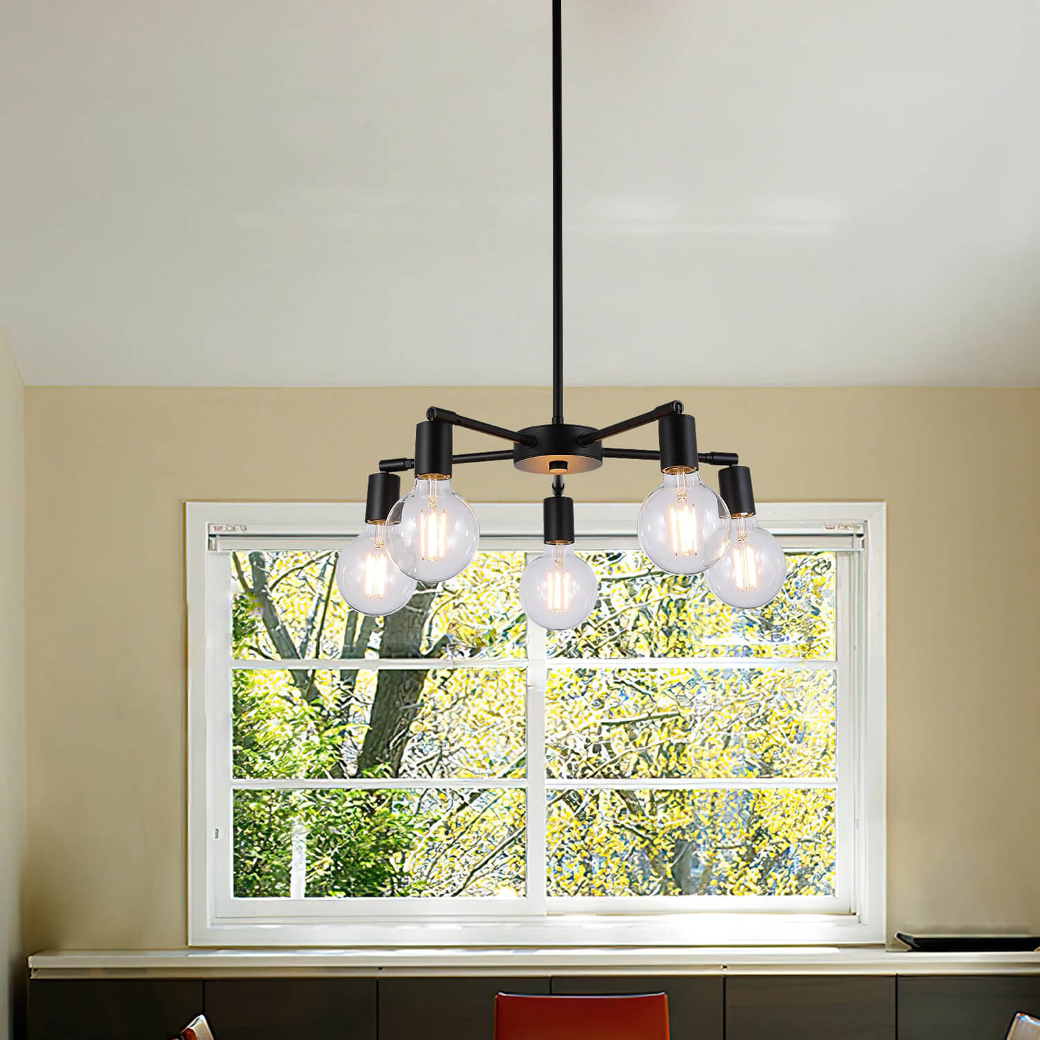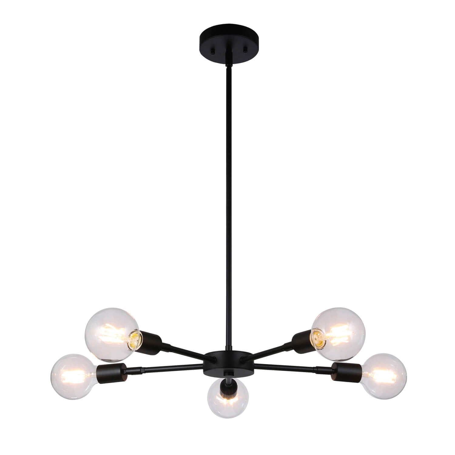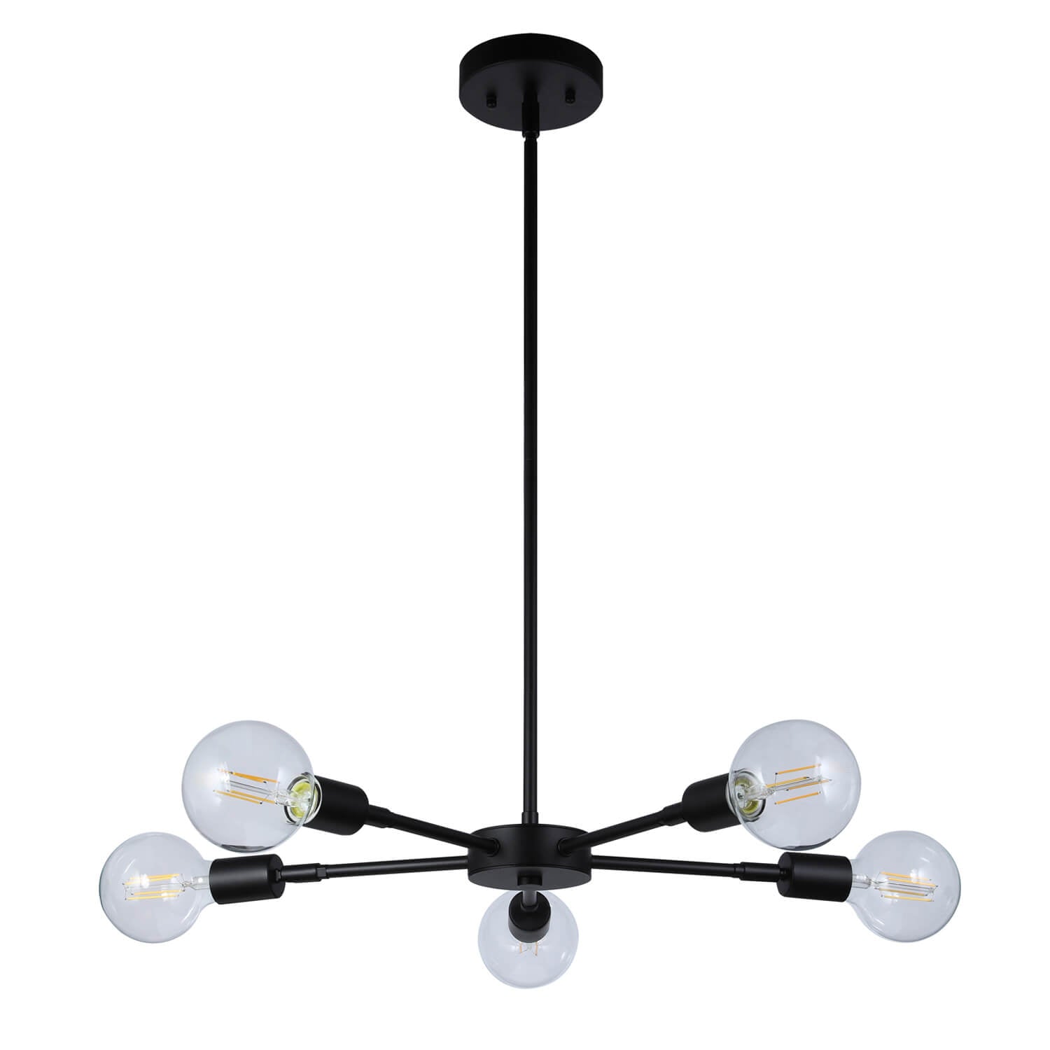 Featuring a matte black finish and with 5 LED Edison Filament BG30 Bulbs; (Bulbs Included) and with hard stems to allow a variety of hanging heights, allows you to customize the fixture to your lighting needs and desired look.