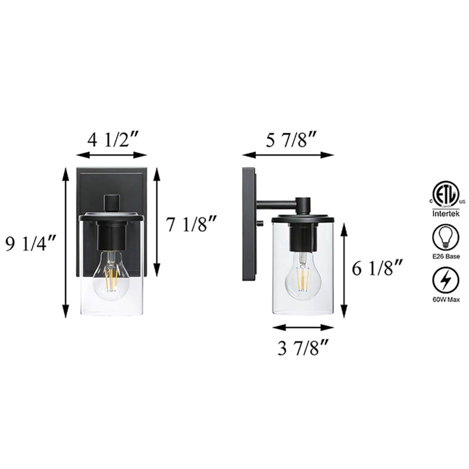 This 1-light black wall light is suggested to use "A" Type Max. 1×60W bulbs for medium base (E26 socket) (incandescent or equivalent LED bulbs).