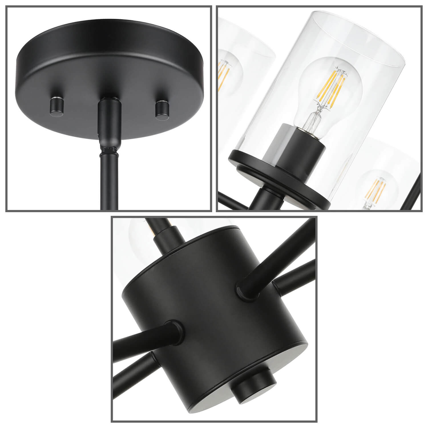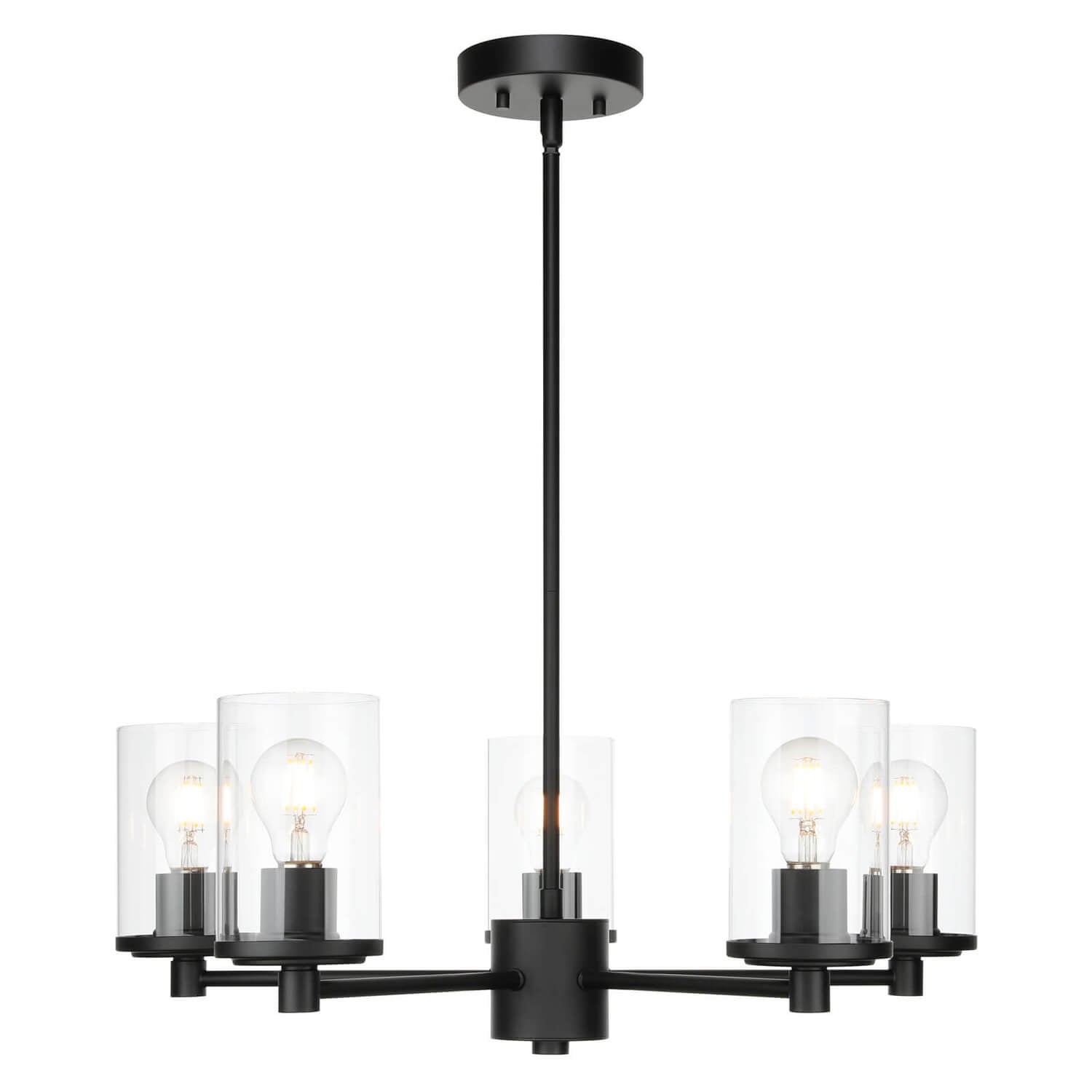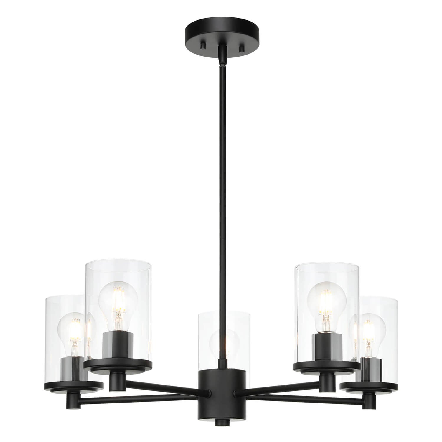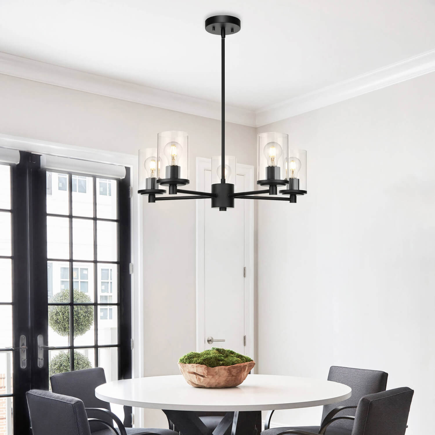 - CONTEMPORARY DESIGN: Chandeliers in Matte Black finish with clear faceted glass, rated for using in dry location. This black 5 light chandelier lights lends an unassuming elegance to dining rooms, living rooms kitchen and foyers with its refined, sculptural structure.