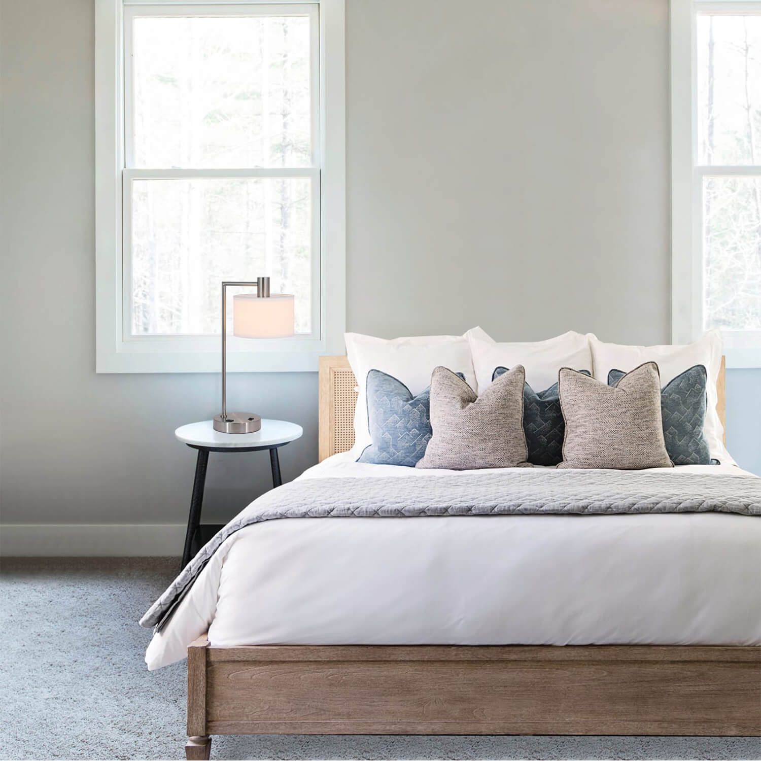 The white fabric lamp shade and top diffuser soften the light while allowing enough light to be cast through, creating a welcoming and warm ambiance.