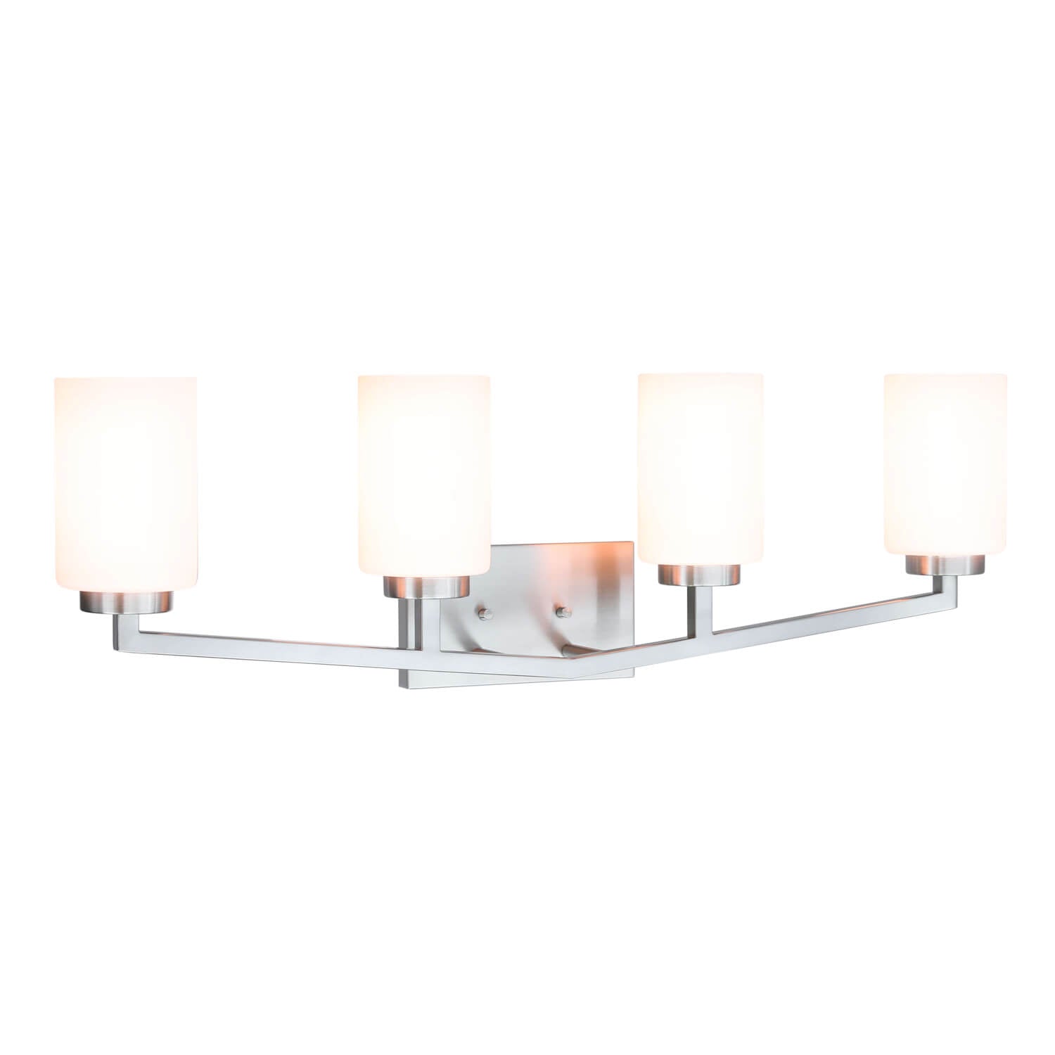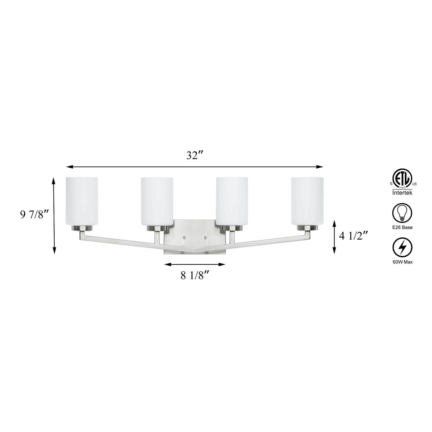 • MODERN DESIGN: Vanity lights features a brushed nickel finish that will complement many contemporary and modern decors. 4 light wall light with white glass shades add interest, soften the light and complete the look of this attractive design and adds sophistication in a bathroom, or over mirror, living room, hallway, kitchen or dining room