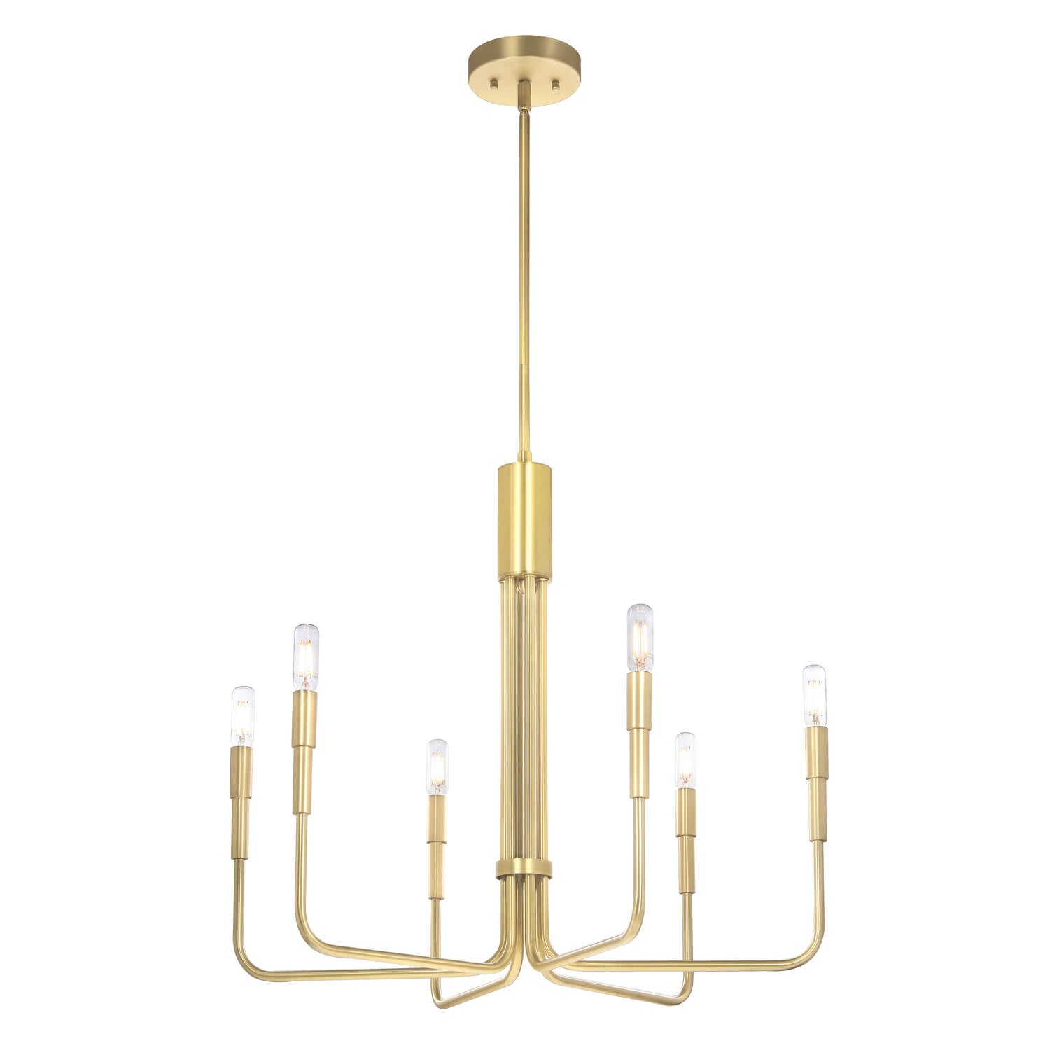 Chandeliers with sleek metal in Satin Brass finish.