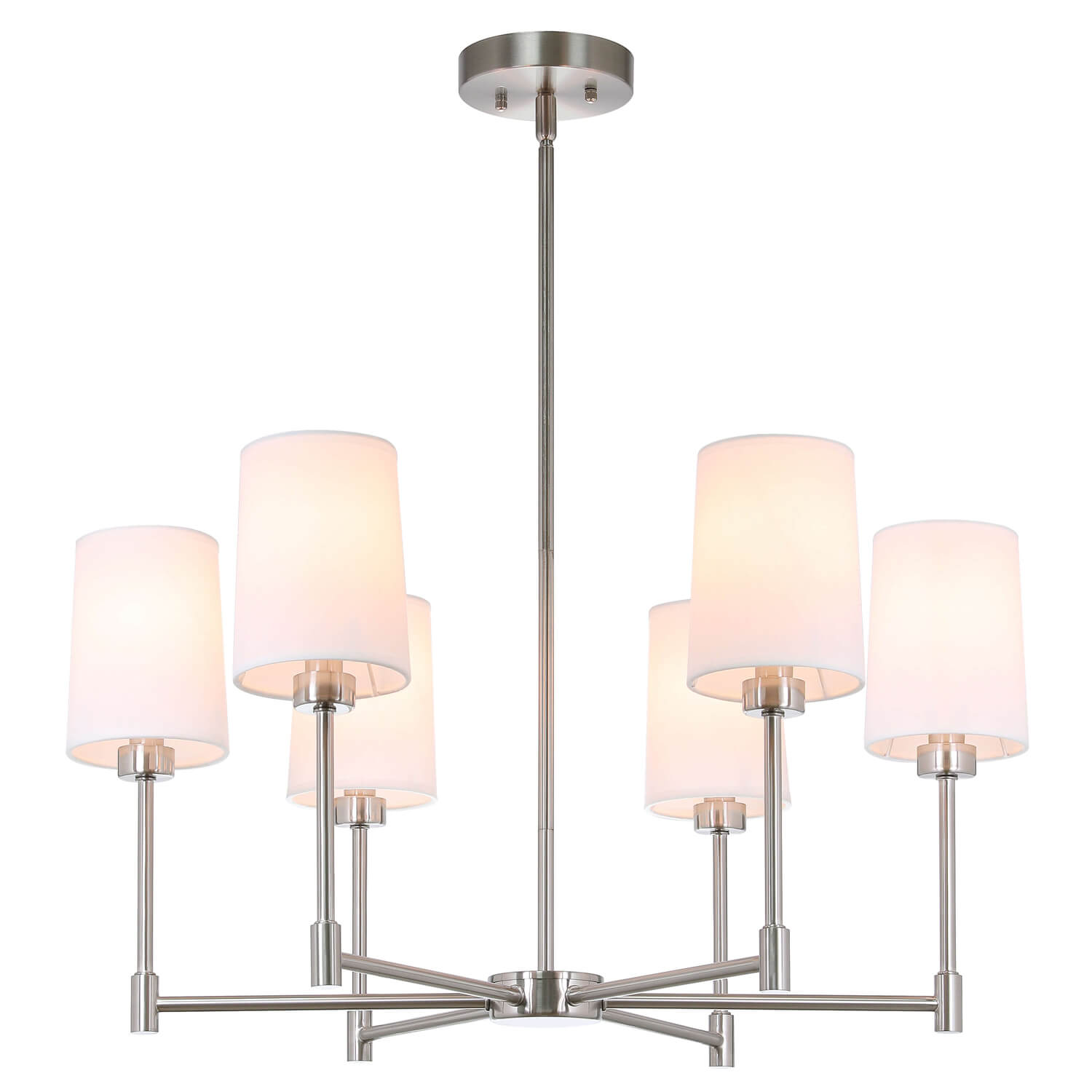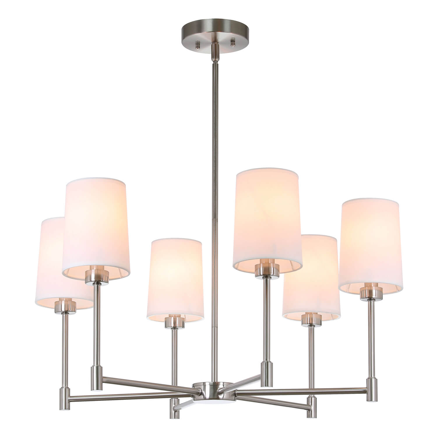 - MODERN DESIGN: Adjustable Chandeliers with thin bar arms in brushed nickel finish with white fabric shade, rated for using in dry location. This modern pendant lighting is simple but will age with time, suitable for dining rooms, living rooms, foyers and any living areas
