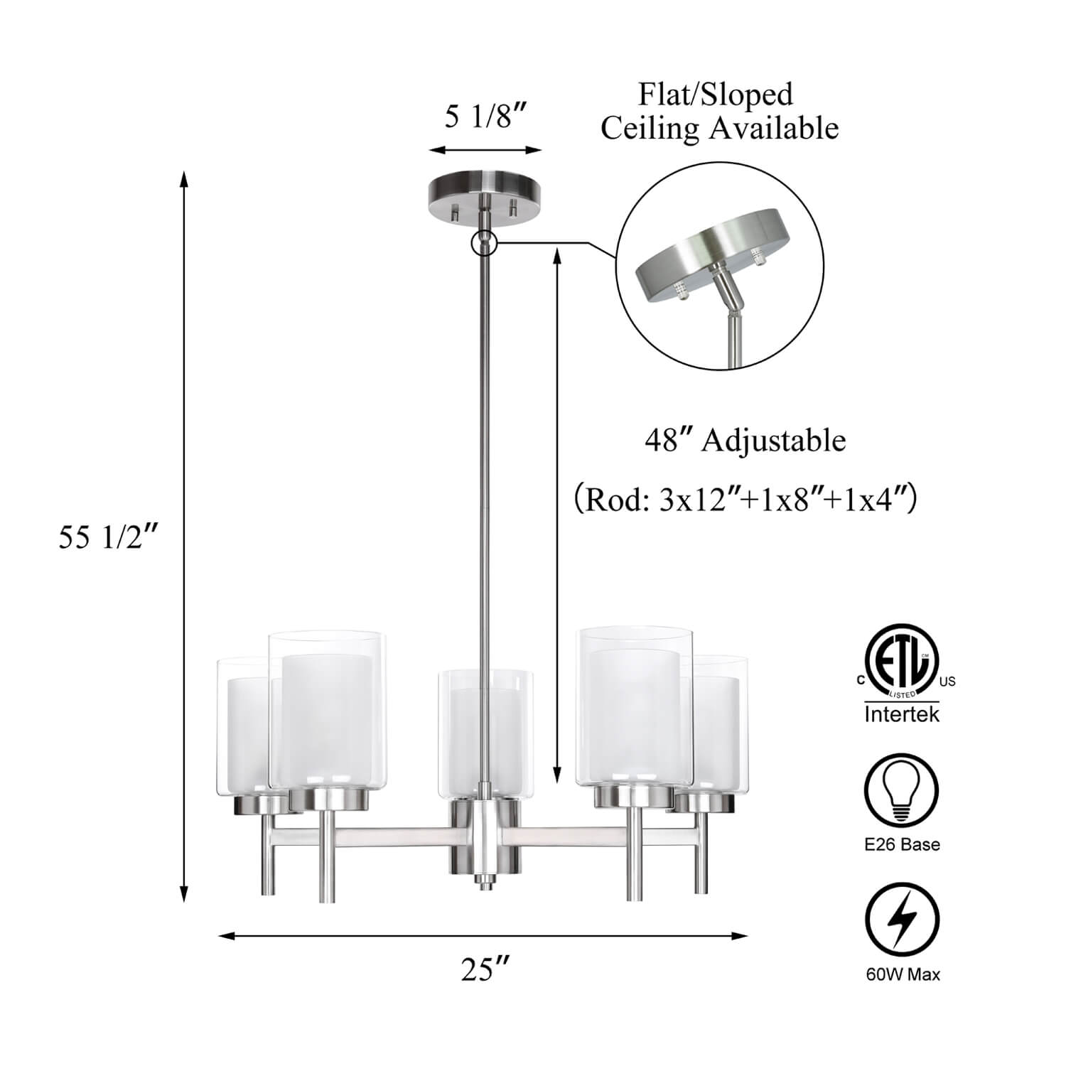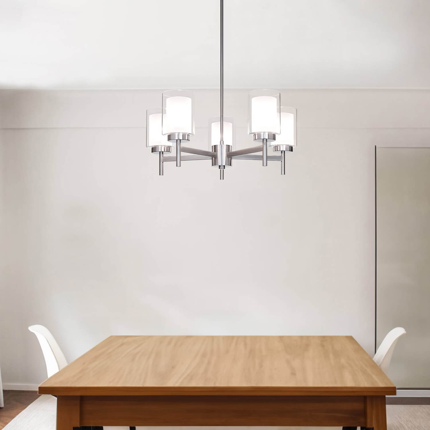 - MODERN DESIGN: Chandeliers with slim but durable brushed nickel arms and dual glass shade (inner frosted glass & outer clear glass) adds a stylish element to your home and install this 5 Light chandelier lighting will create an essential decor to kitchen islands, over dining room tables, bedroom ceiling, or in areas with high ceilings such as entryways or foyers.