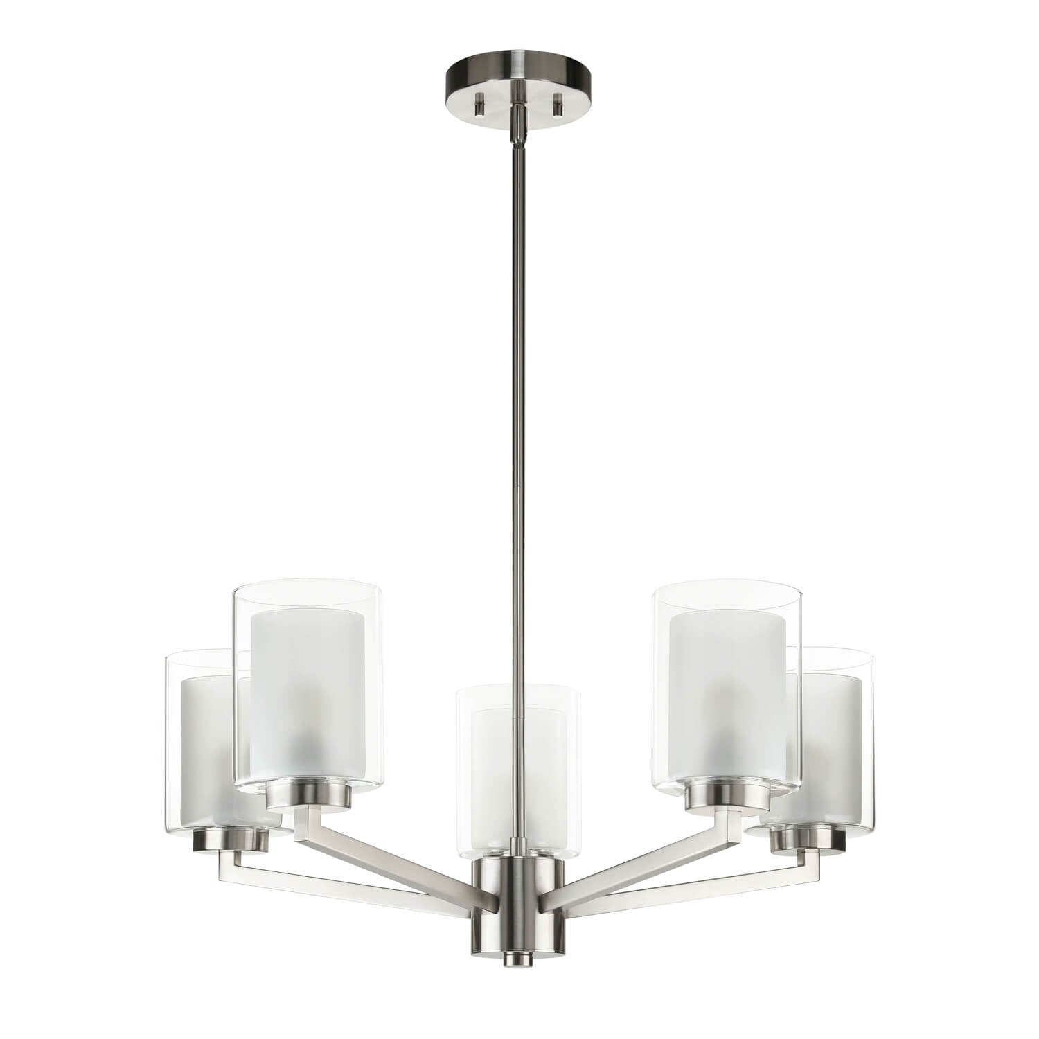 5 light chandeliers features a modern look with its brushed nickel finish and dual glass shades (cylinder clear outer glass and frosted inner glass).