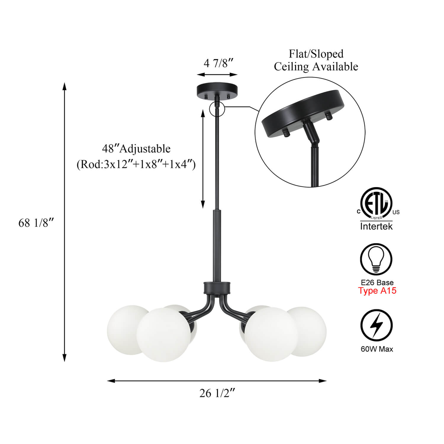 - MEDIUM BASE SOCKET: This adjustable chandelier light fixture suggest to takes six maximum 60 watt Type A15 Medium base bulbs (incandescent, CFL or LED compatible). Bulbs not included.