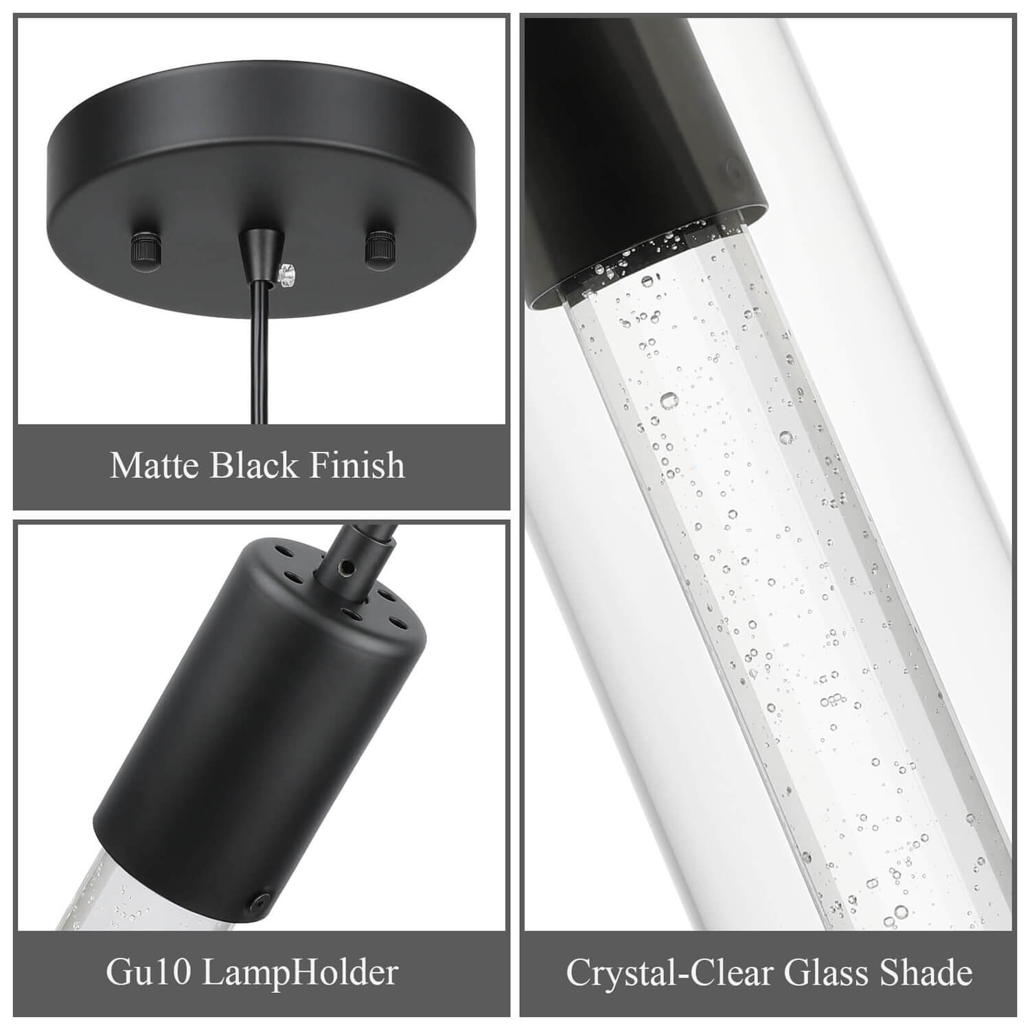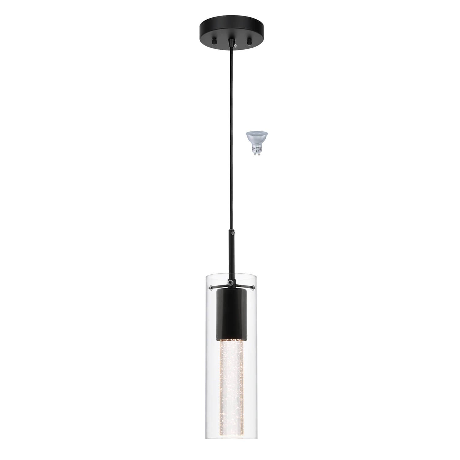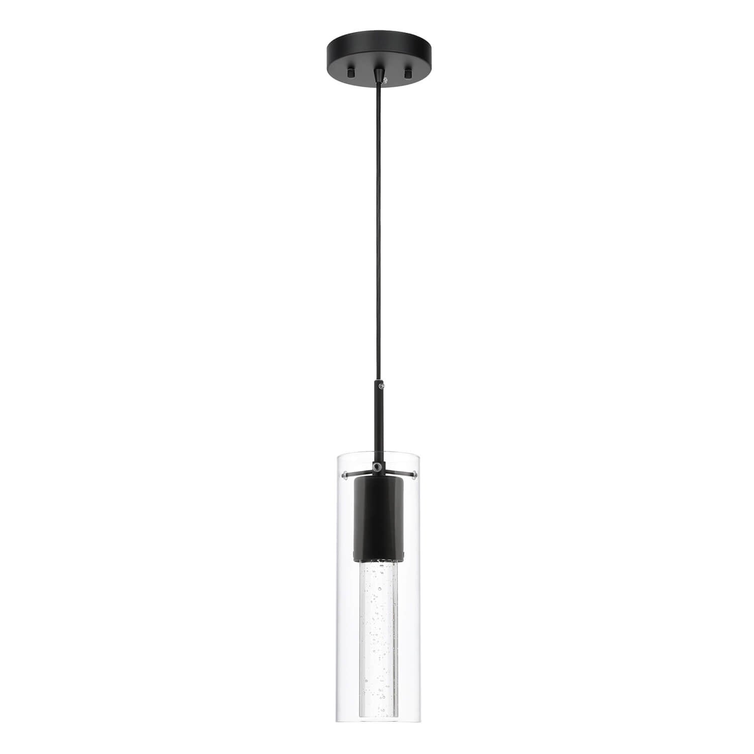 - FEATURE: Pendant lighting fixture with a clear glass cylinder shade and crystal cylinder with bubble shade in matte black Finish. This effervescent bubbles in this mini hanging pendant lights will sparkle nicely the light when LED bulbs lights on that give you starry lights and remarkable quality of light that add a stylish touch and modern look to your home.