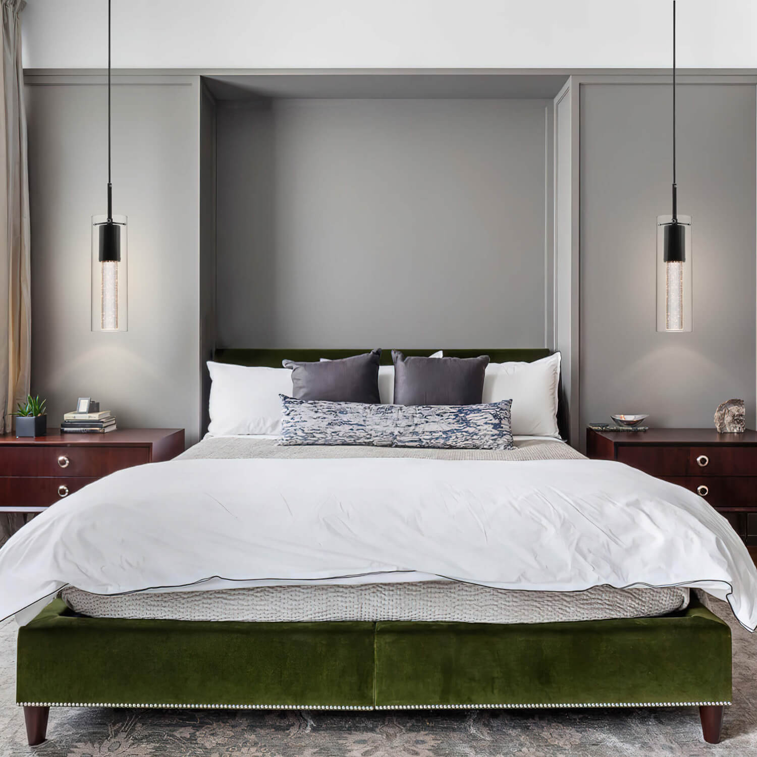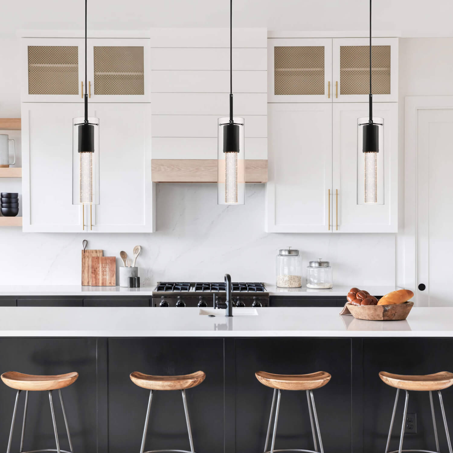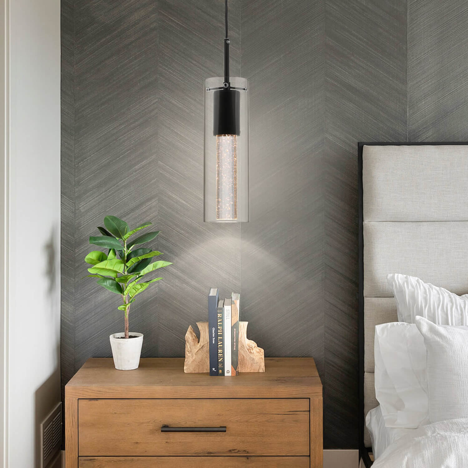 - FEATURE: Pendant lighting fixture with a clear glass cylinder shade and crystal cylinder with bubble shade in matte black Finish. This effervescent bubbles in this mini hanging pendant lights will sparkle nicely the light when LED bulbs lights on that give you starry lights and remarkable quality of light that add a stylish touch and modern look to your home.