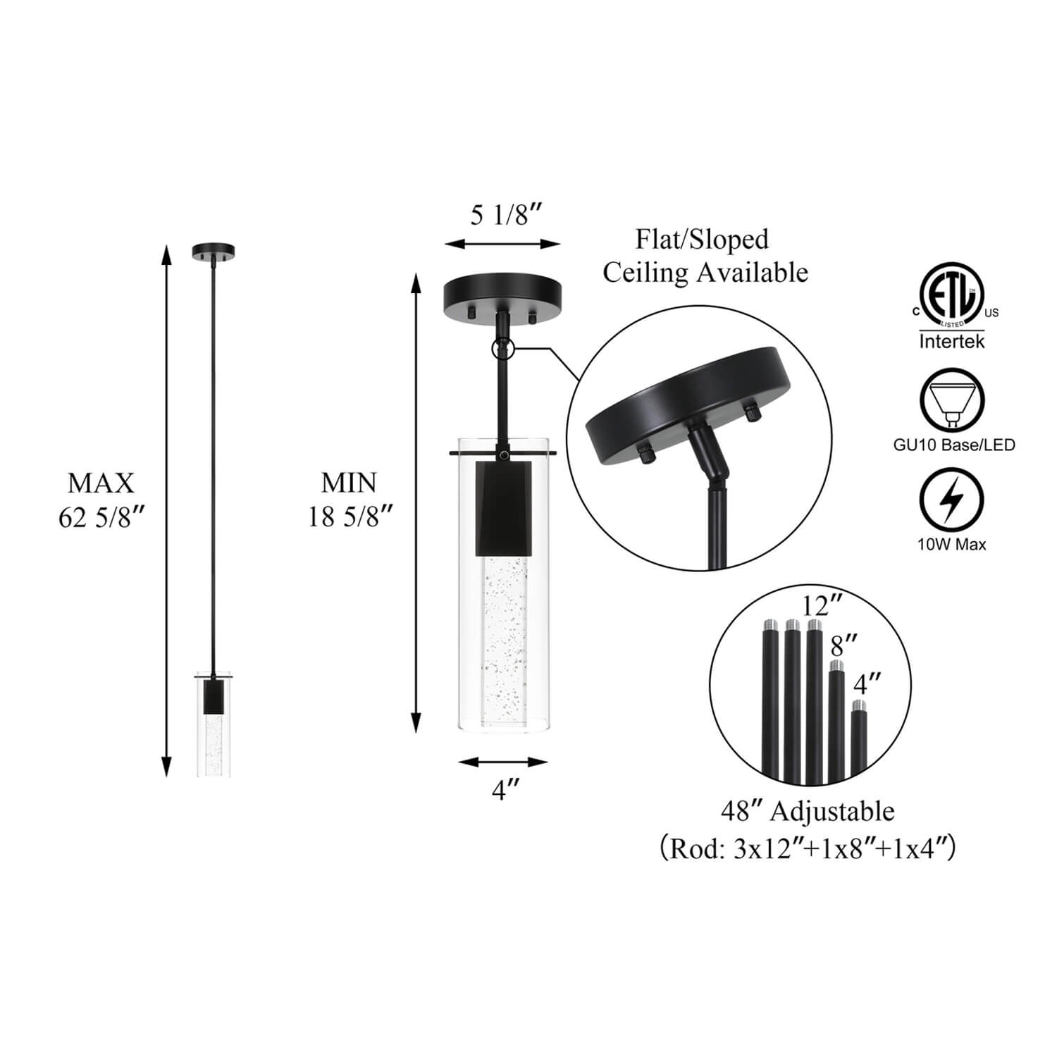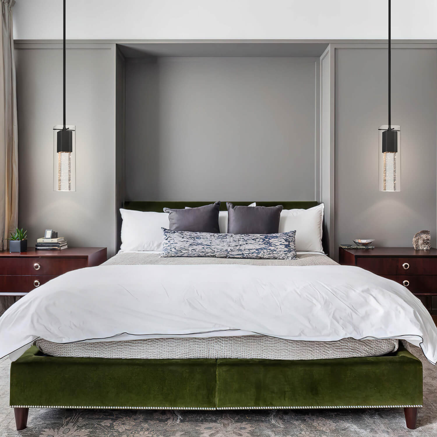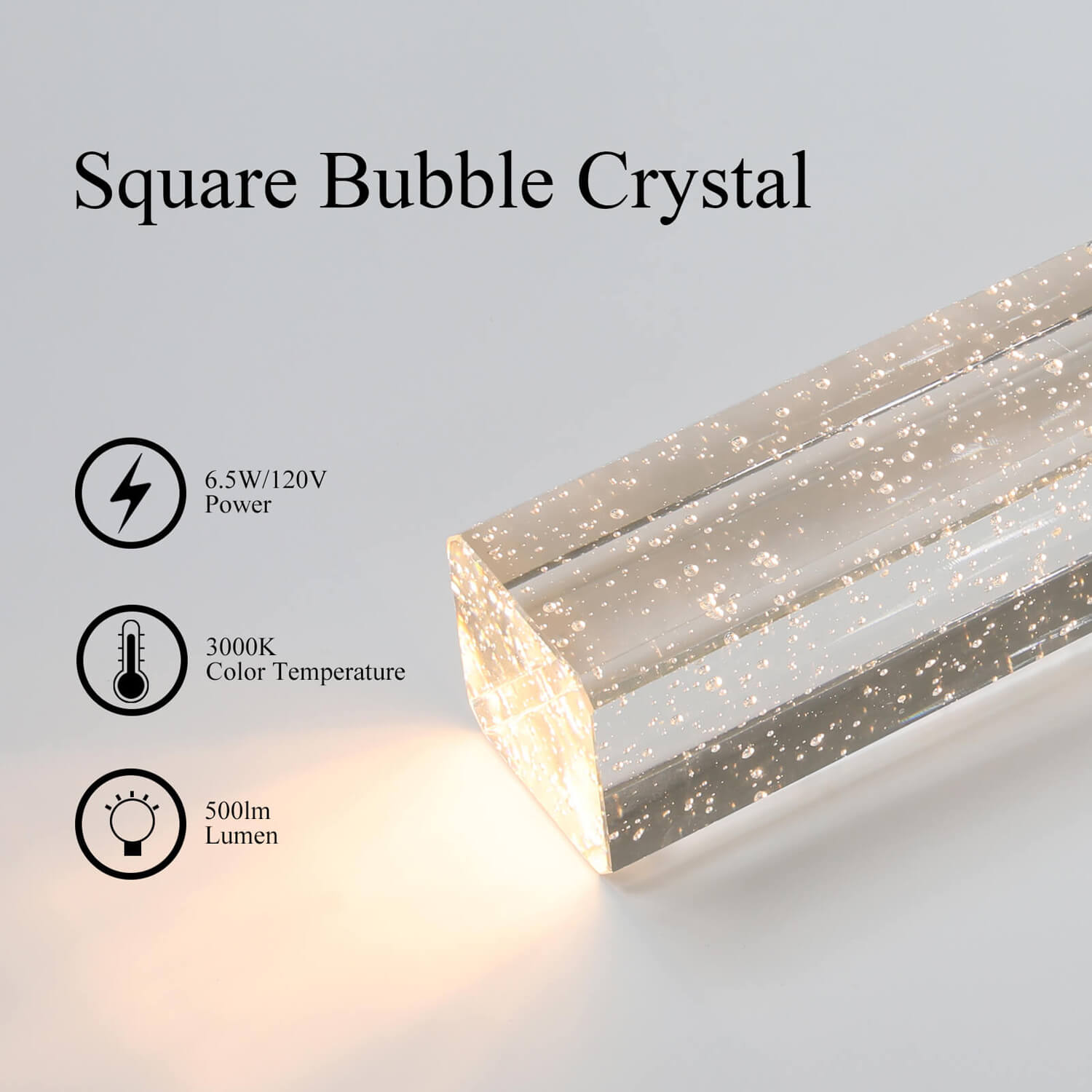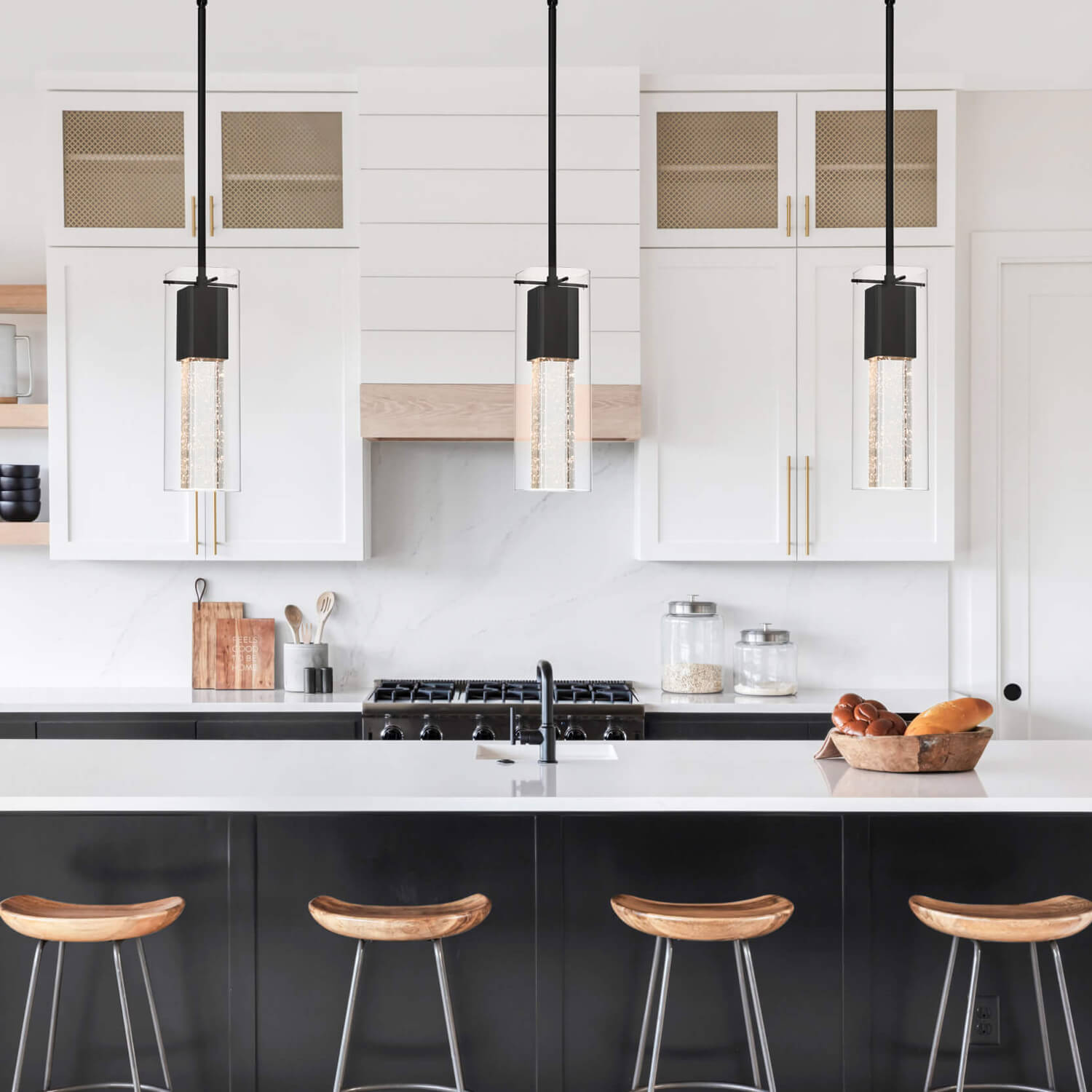 - FEATURE: Hardwired. Pendant Light with clear glass shade and square bubble crystal column inside. Matte Black Finish accents and canopy, metal construction. This effervescent bubbles in this mini kitchen hanging pendant lighting will create the stunning visual light beam refract through the crystal bubbles when LED bulbs lights on, then this pendant light will be the eye-catching bright spot in your home.