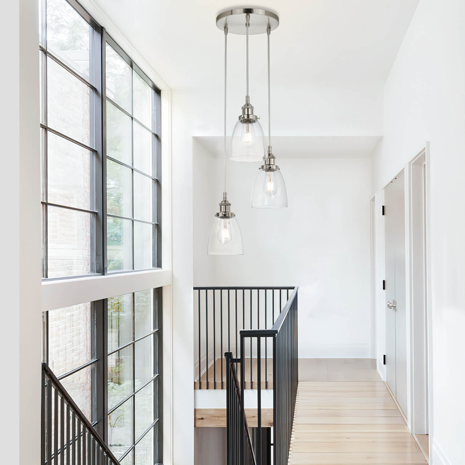 - MODERN DESIGN: 3 light Cluster pendant lighting features a modern cluster design with glass shades, each housing a light bulb, creating an inviting glow that enhances the ambiance of your space. Perfect for the stairwell hanging lights, kitchen island lighting, staircase pendant light, hallway, entryway, bar pendant light, corridor, foyer, etc