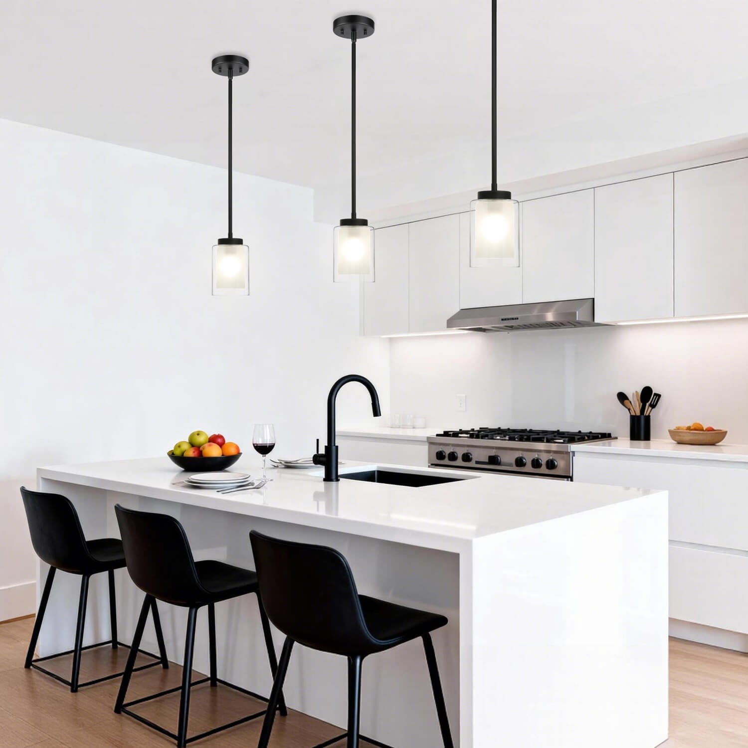 - FEATURE: Single kitchen island lighting with dual glass shade in matte black finish features a clean and simple design. Hanging light fixture comes with adjustable hard stems (3x12" + 1x8" + 1x4") for customizable length and height that can be adjusted based on the installation area. Swivel canopy features this pendant light to mount on vaulted or sloped ceilings.