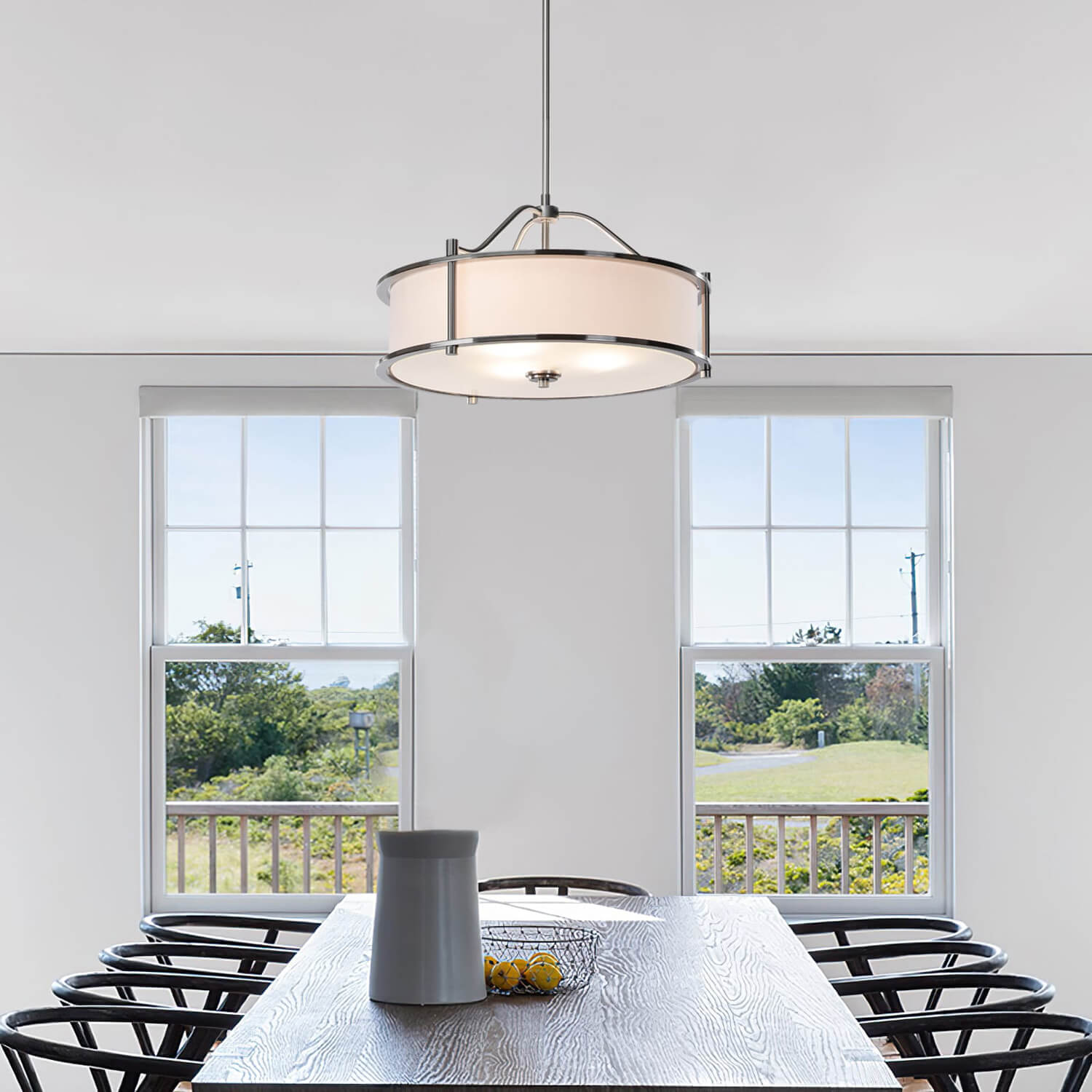 - FEATURE: Pendant lighting in brushed nickel features a simple a unique drum shade design with durable steel frame and glass diffuser that completes the comfortable and elegant look, fabric drum shades help to soften lights and filter flickers and ghosts in the light. This 3 light drum pendant light can create transitional style, modern style or casual style that fit most homes’ decor, perfect to achieve your desired fashion or functional needs in your home.