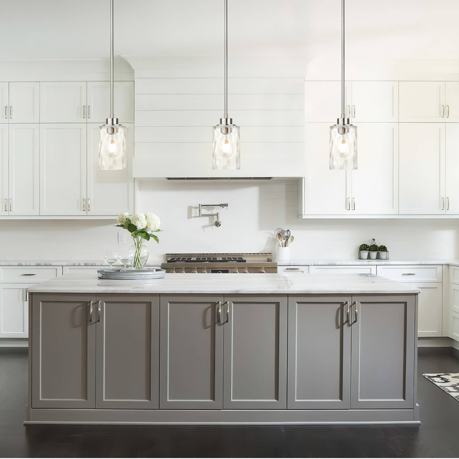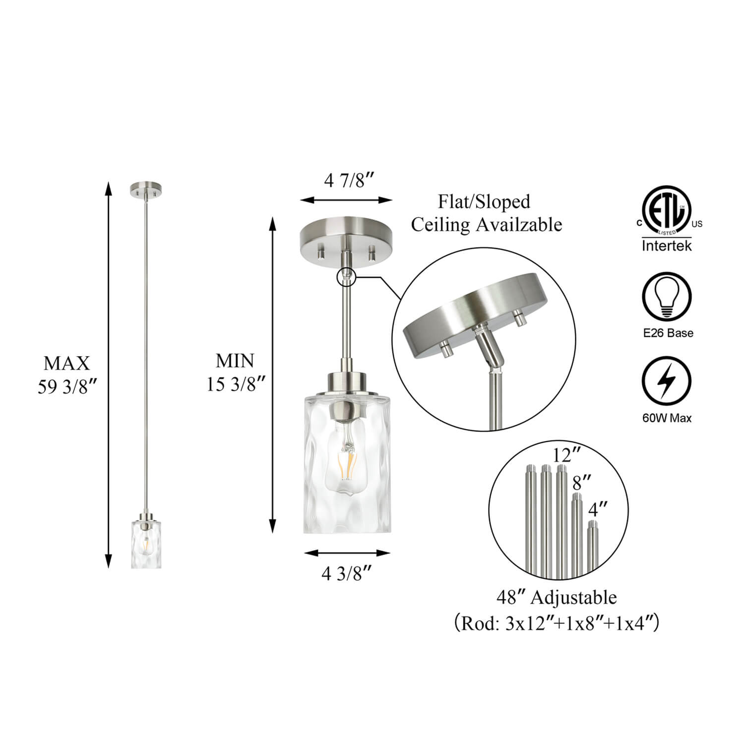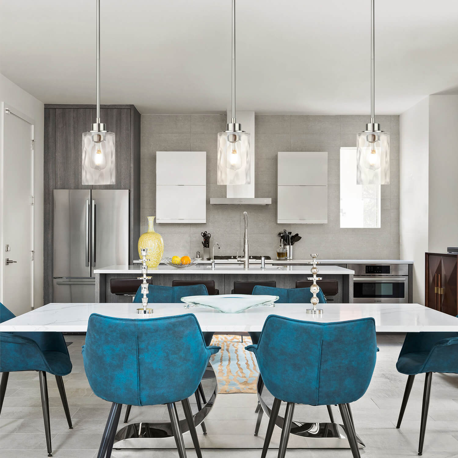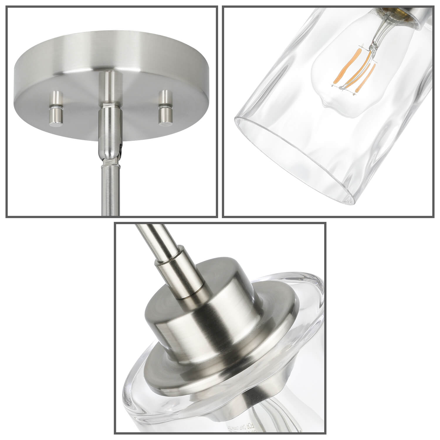 - FEATURE: Hardwired. Pendant lighting fixture with water ripple glass shade refract the light and shade, creating a sparkling crystal clear romantic atmosphere when lights on. Adjustable kitchen hanging light comes with adjustable hard stems (3x12" + 1x8" + 1x4") for customizable length and height that can be adjusted based on the installation area.