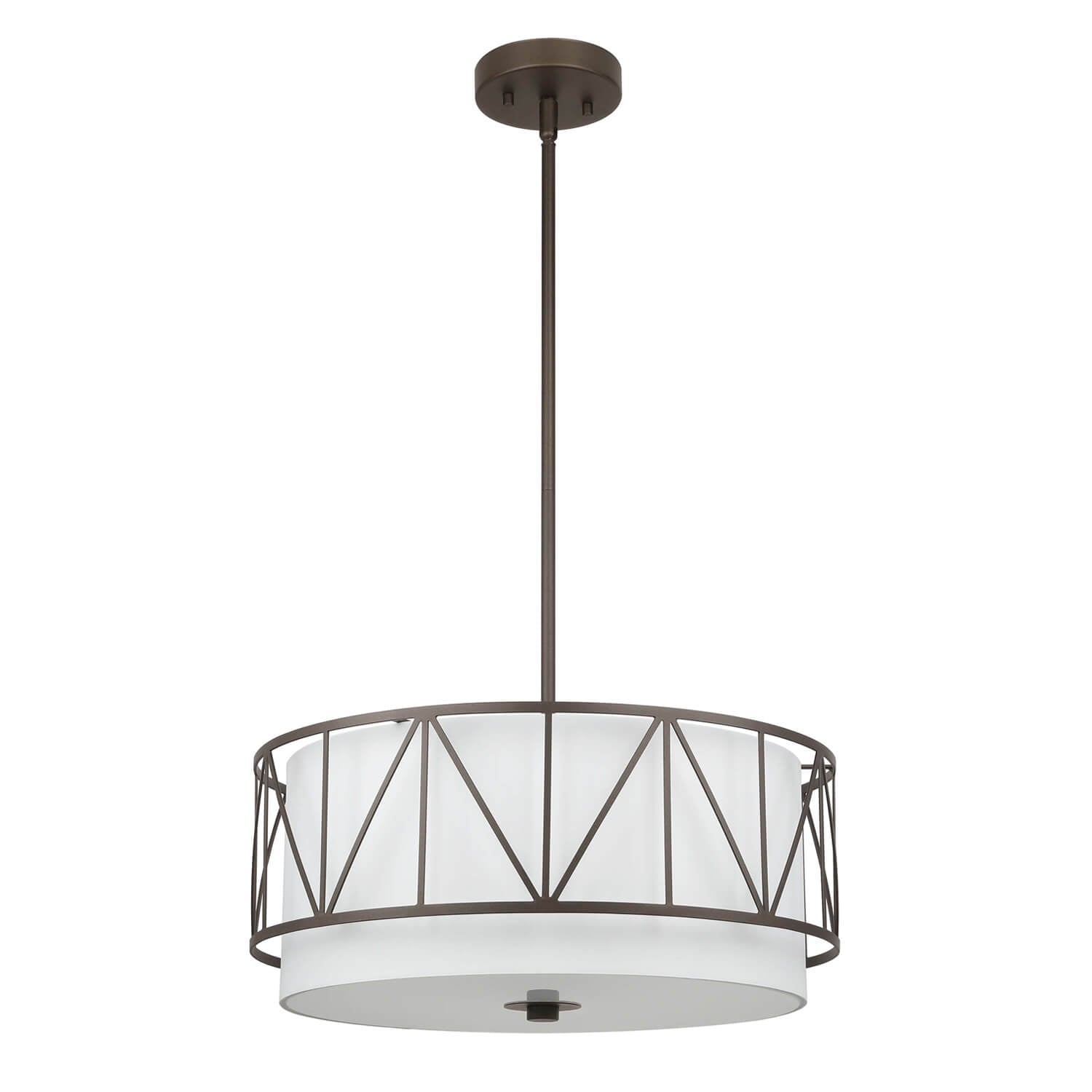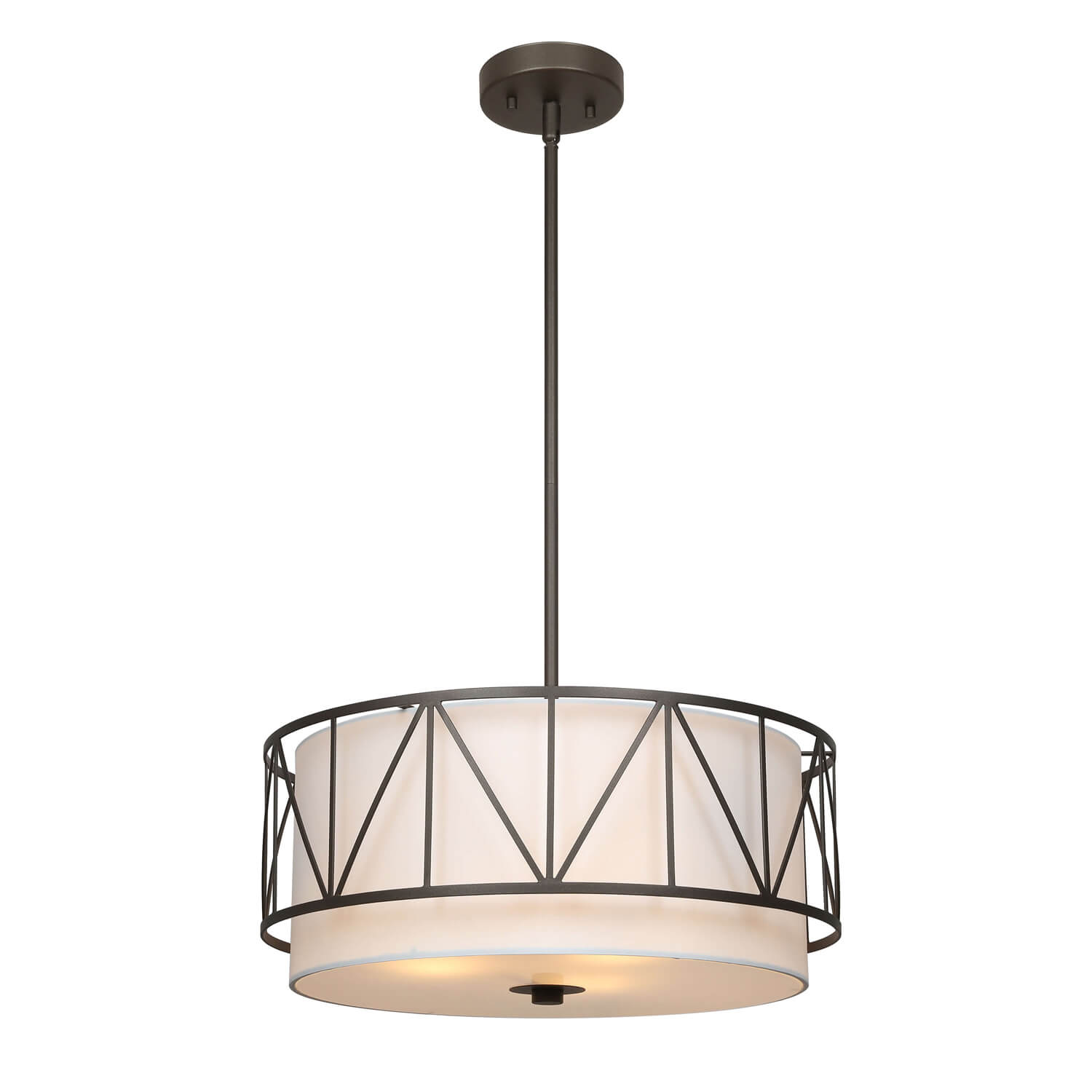 This drum shade chandelier features an 18-inch white fabric drum shade, a dark bronze metal cage, and a white glass diffuser, creating a timeless and sophisticated look for your space.