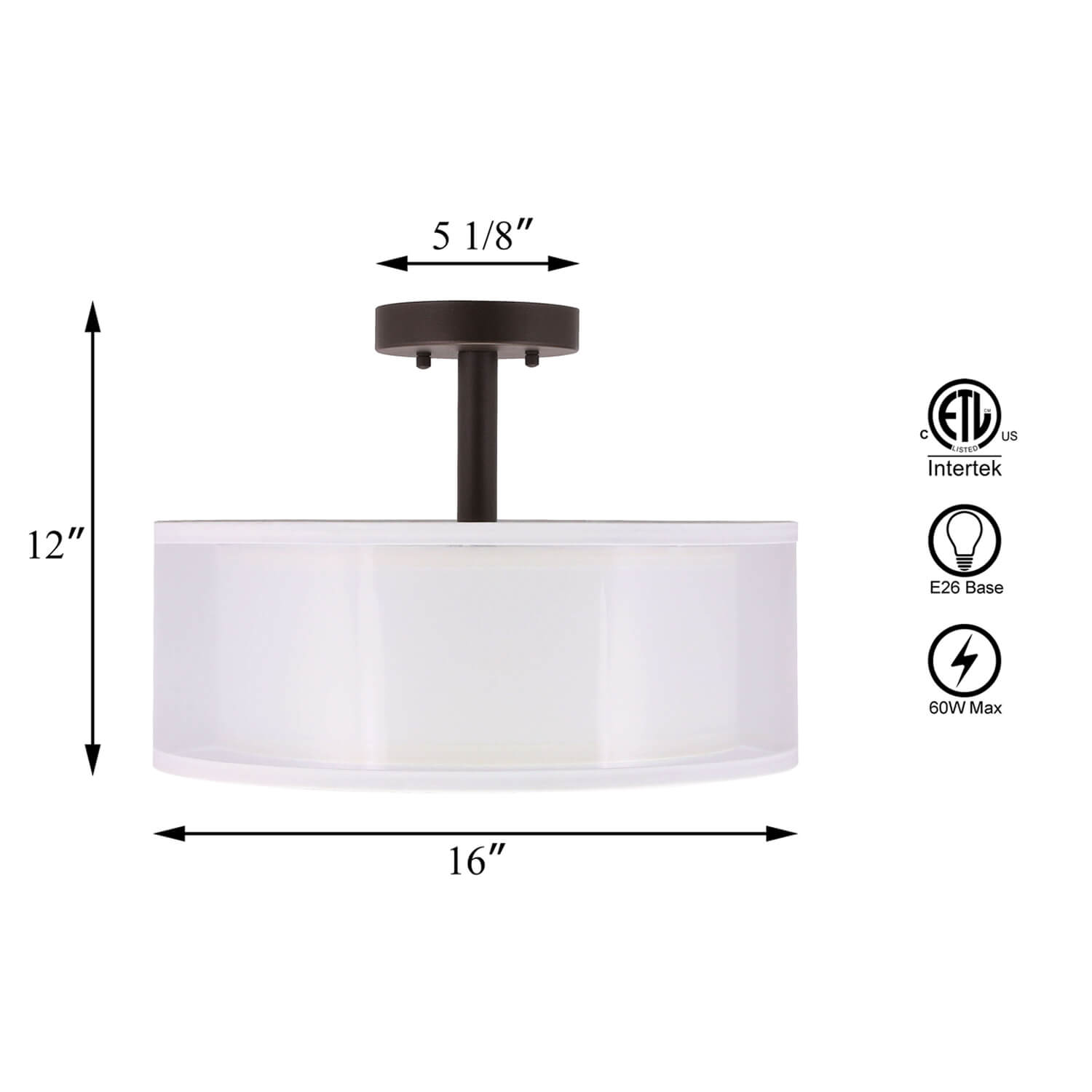 - FEATURE: This Semi flush mount ceiling light in dark bronze with double fabric shade and frosted glass diffuser.The drum ceiling light is the perfect blend of classic exquisiteness and modern boldness.The drum-shaped fixture has a dual outer and inner shade that adds a delightful dimensional aspect and livens up your ceiling, provide a balanced warming lighting to your space.