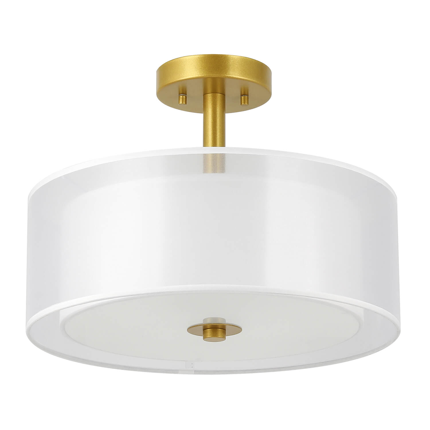 This drum semi flush ceiling light featuring a smooth gold brass finish (Powder Coating finish) and dual fabric shade, frosted glass diffuser.