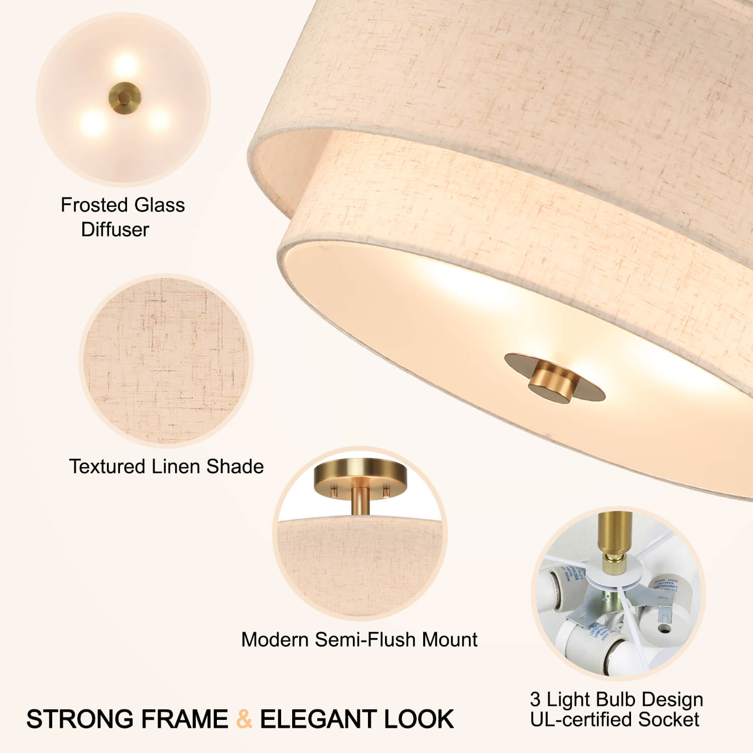 - FEATURE: Hardwired; Flush mount light fixture with Brushed Brass finish metal canopy and body 2 layer fabric shade and frosted glass diffuser create a warming and romantic atmosphere for your living space. This double drum ceiling light fixture is not only resistant to scratches and breakage, ensuring durability and long-lasting beauty.