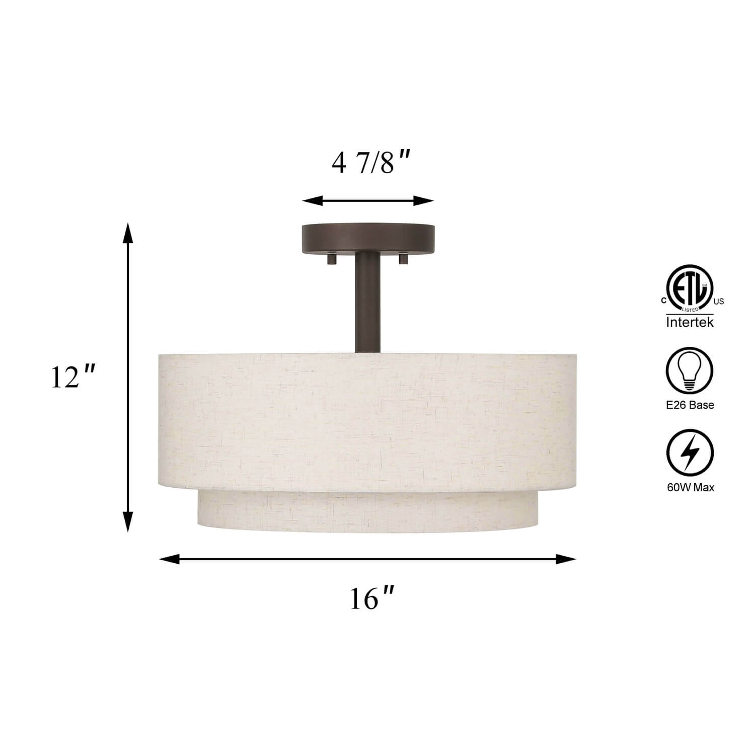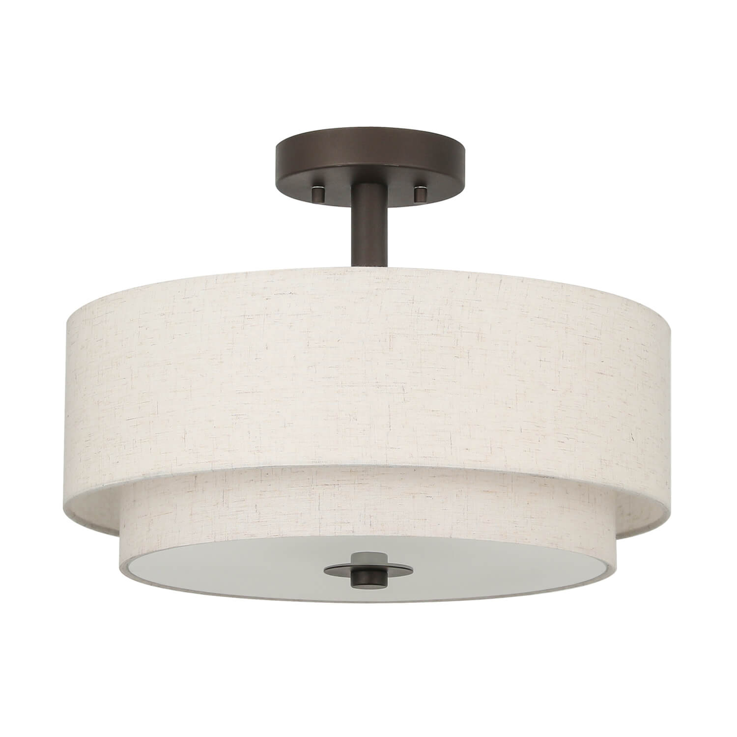 The 2-tier dual fabric shade and frosted glass diffuser, combined with solid dark bronze hardware and canopy, make this semi flush mount ceiling light look simple yet warm as it diffuses soft, ambient light when illuminated.