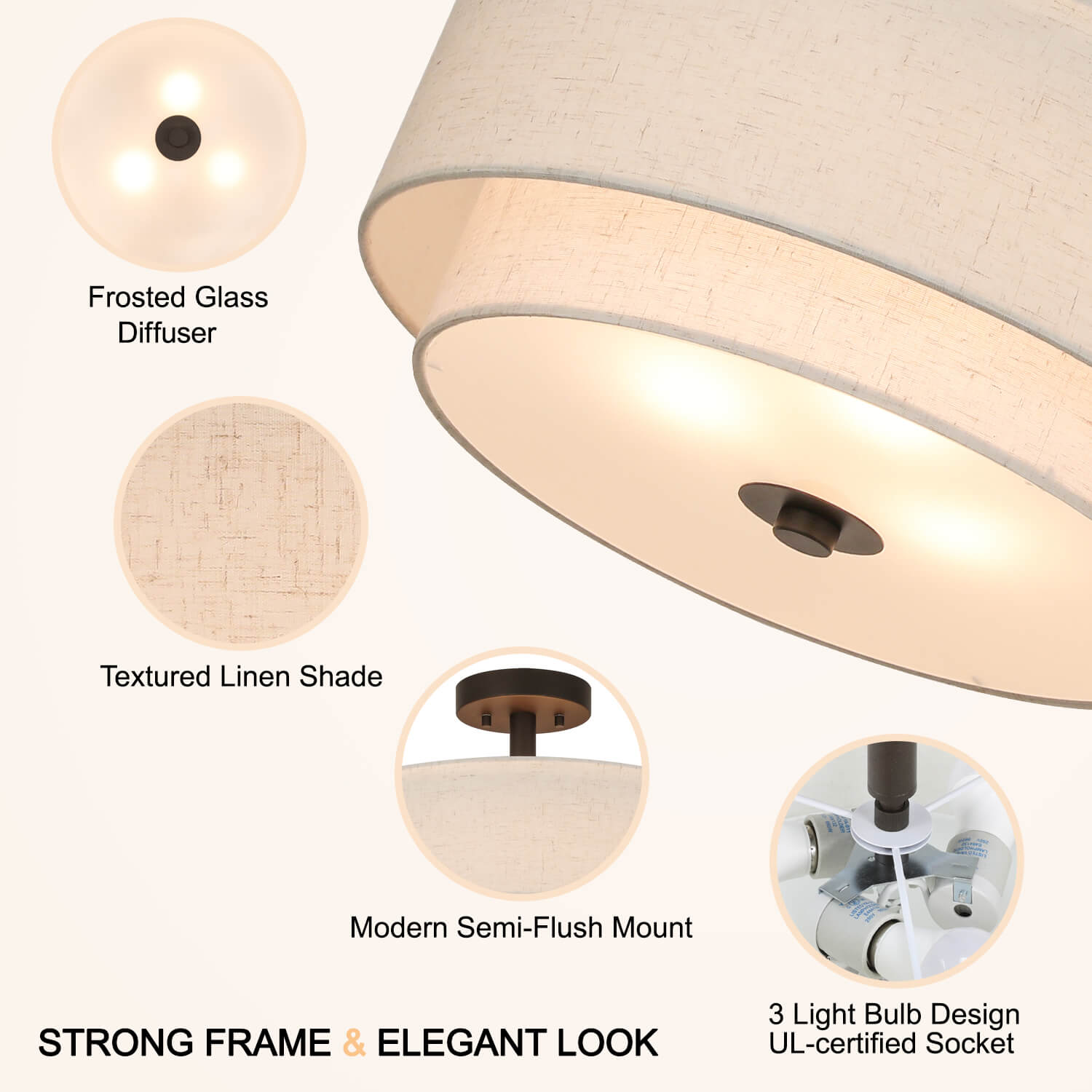 - FEATURE: 3 light semi flush mount light with iron hardware and dual fabric drum shade, frosted glass diffuser. This brass close to ceiling light fixture with powder coating gold Brass finish metal canopy, accents and trim that create a warming and romantic atmosphere for your home.