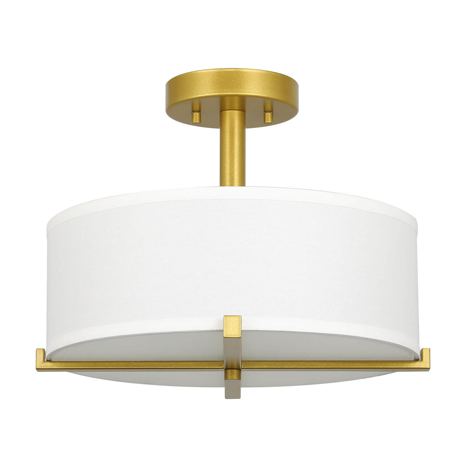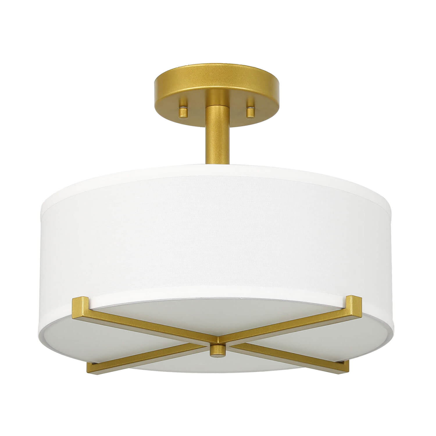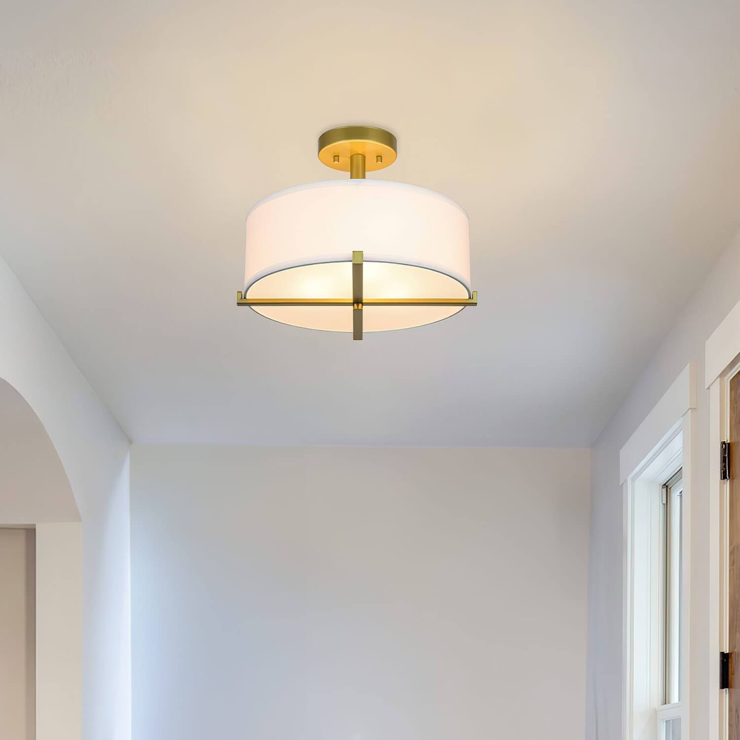 - FEATURE: Hardwired. The drum semi flush light is with off-white fabric and gold brass finish solid metal decorative frame metal hardware that is providing a elegant look. Frosted glass diffuser spreads light to create a warm, cozy ambiance. Hanging this close to ceiling lamp fixture can evoke mid-century modern and traditional styles to your living rooms.
