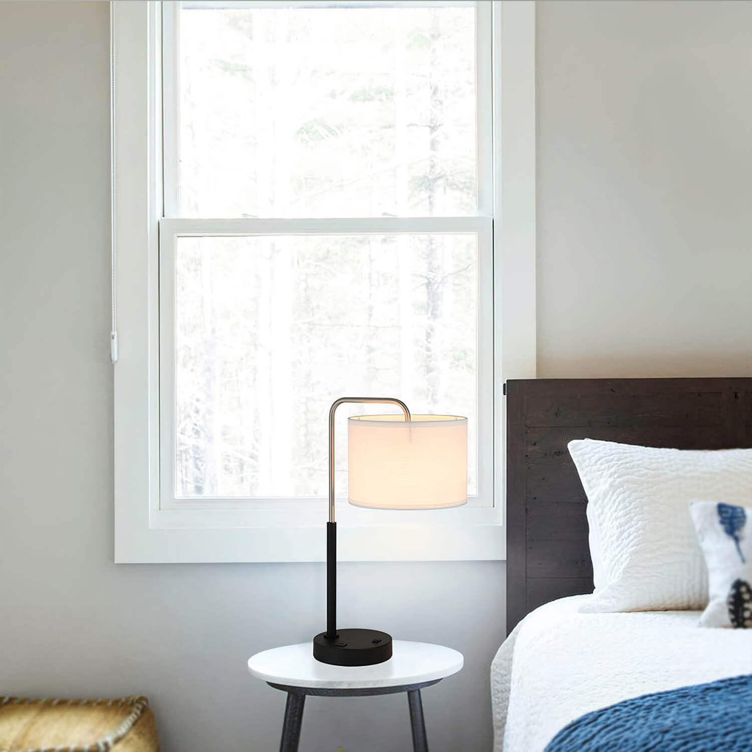 - FEATURE: Bedside table lamp features brushed nickel lamp body and matte black base and white drum shade that is the simple but modern design. The bedroom reading table desk lamp will definitely be an eye catching lighting to set beside corner table, office desk, night table, coffee table, dinning table that will be also convenient for reading.