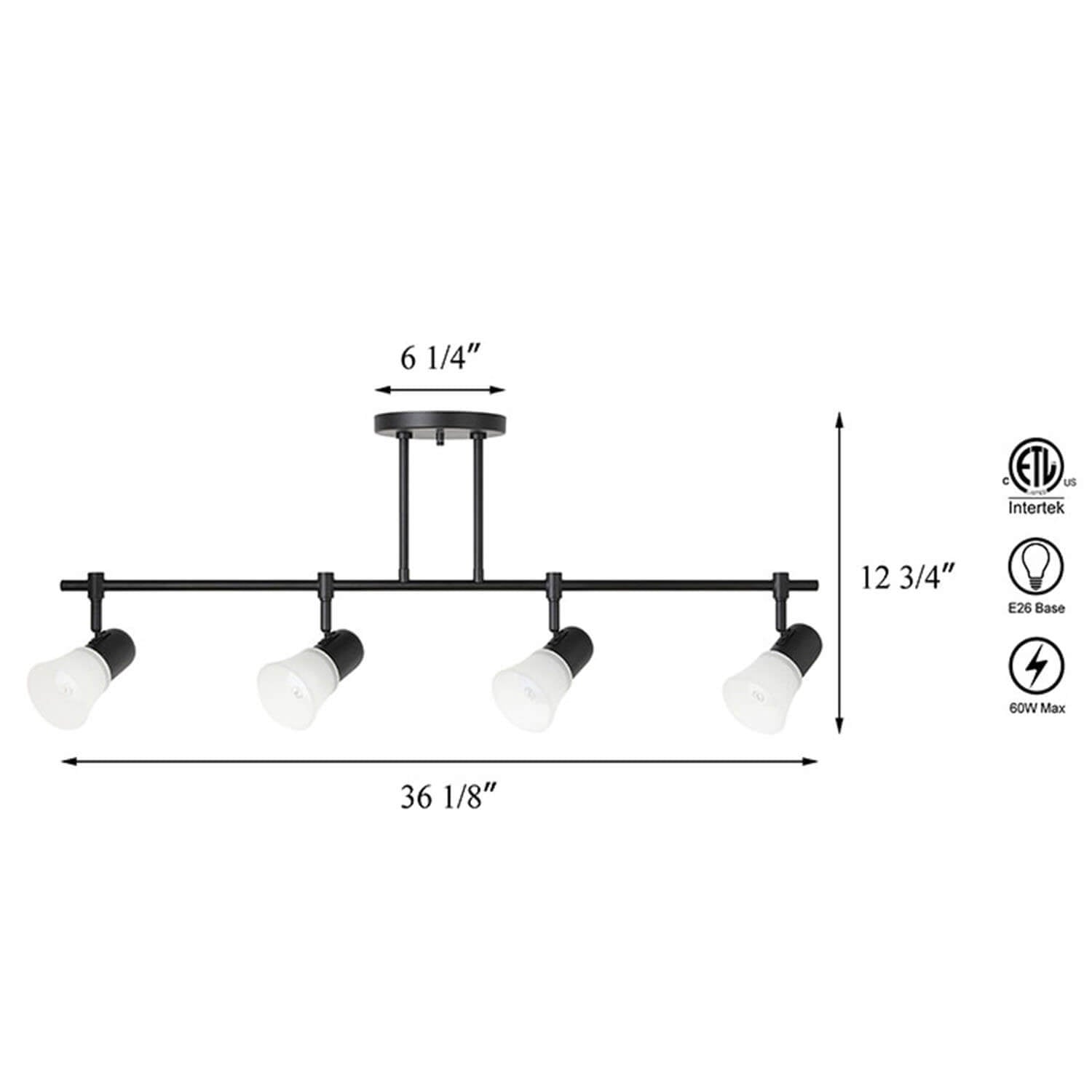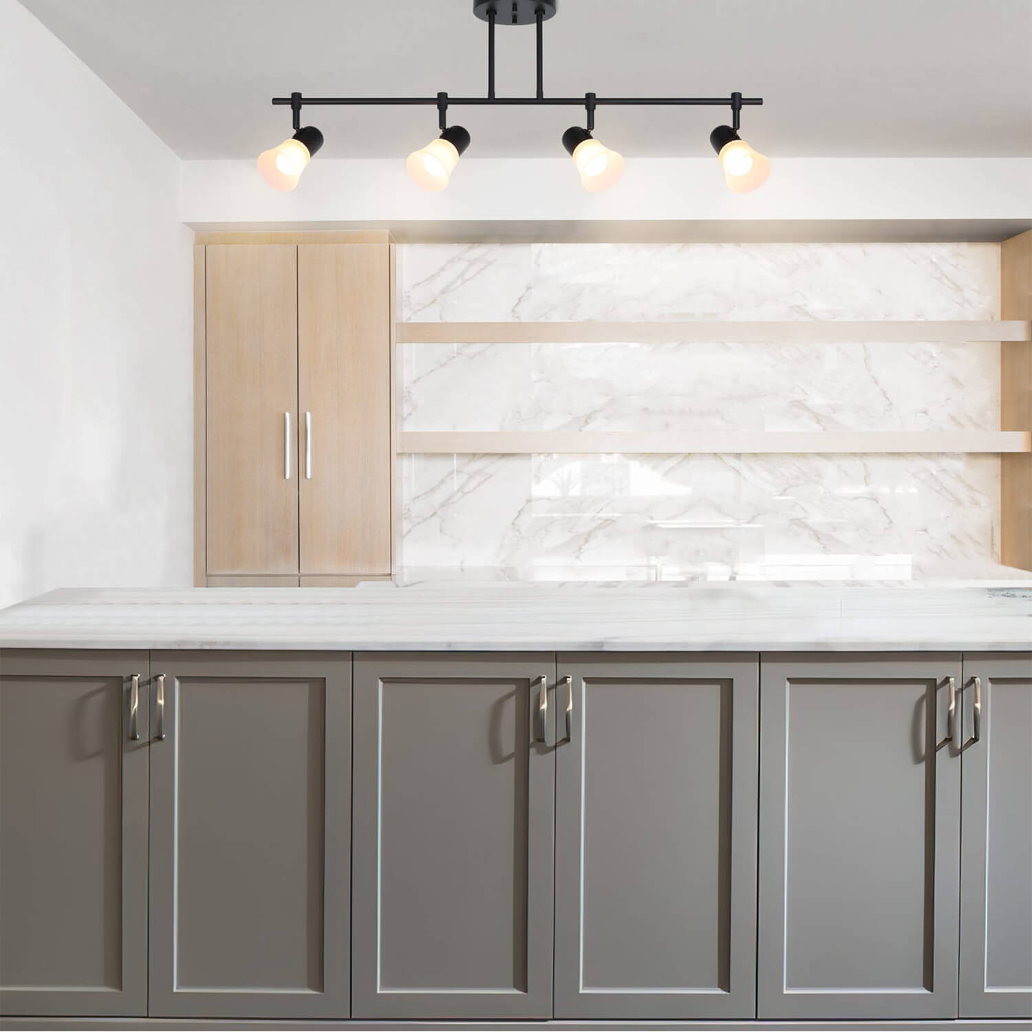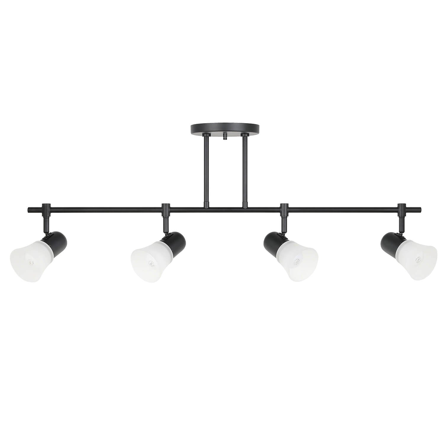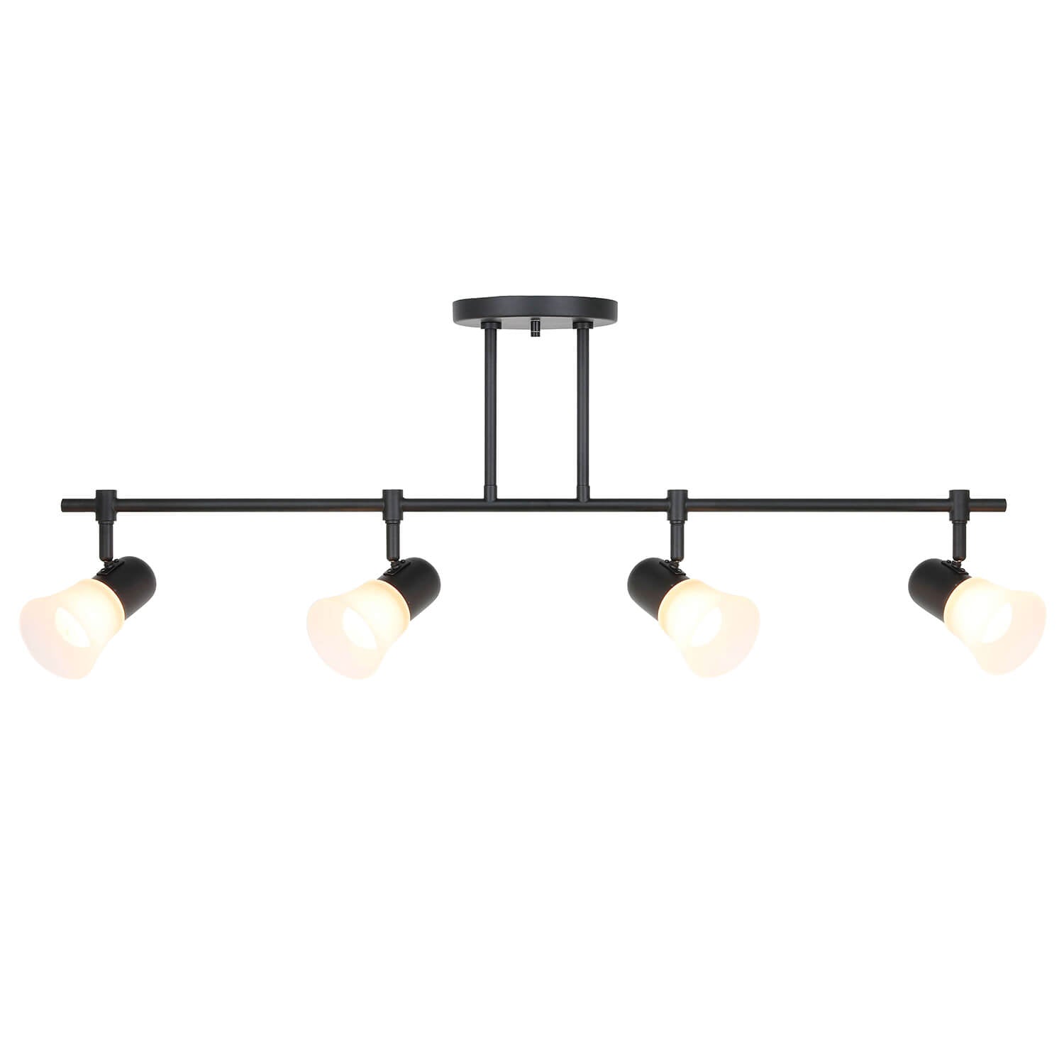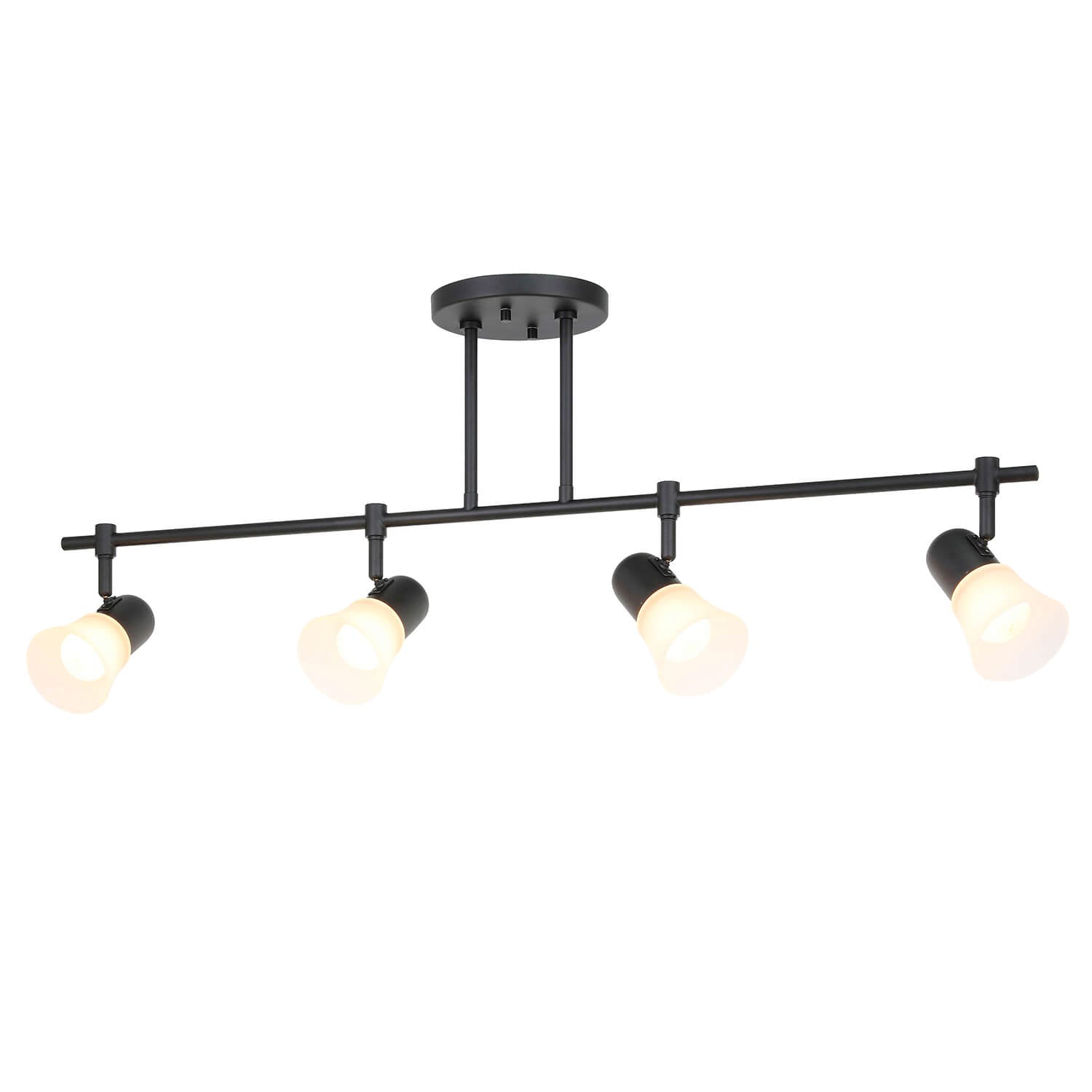 - MODERN DESIGN: Hardwired. This 4 light ceiling track fixture is with a unique look on comfort and simplicity modernizes the farmhouse trend with a matte black finish and frosted glass to create a modern industrial elements. Kitchen island track light with pivoting track heads help create the multi-directional lighting design that can be focus them strategically to create the ultimate lighting experience in every room