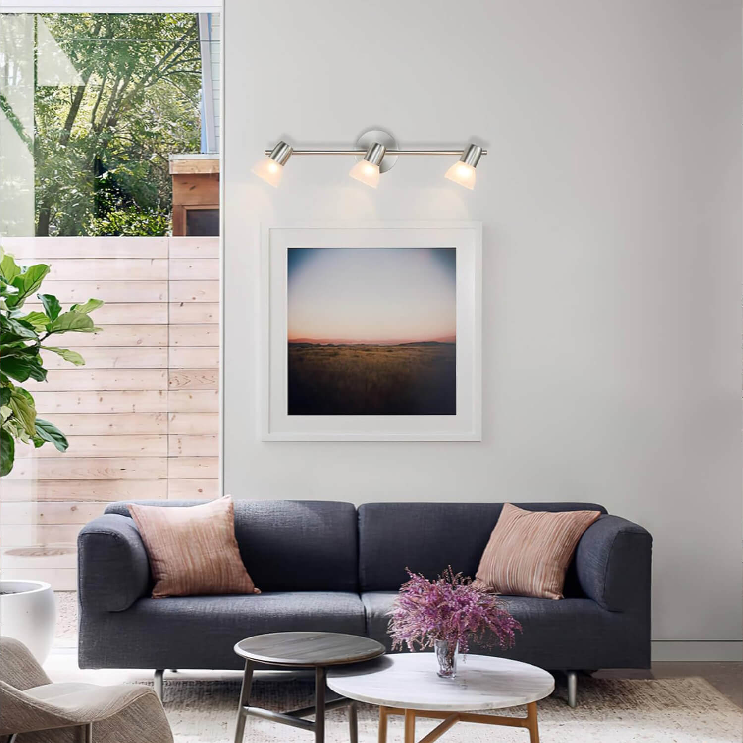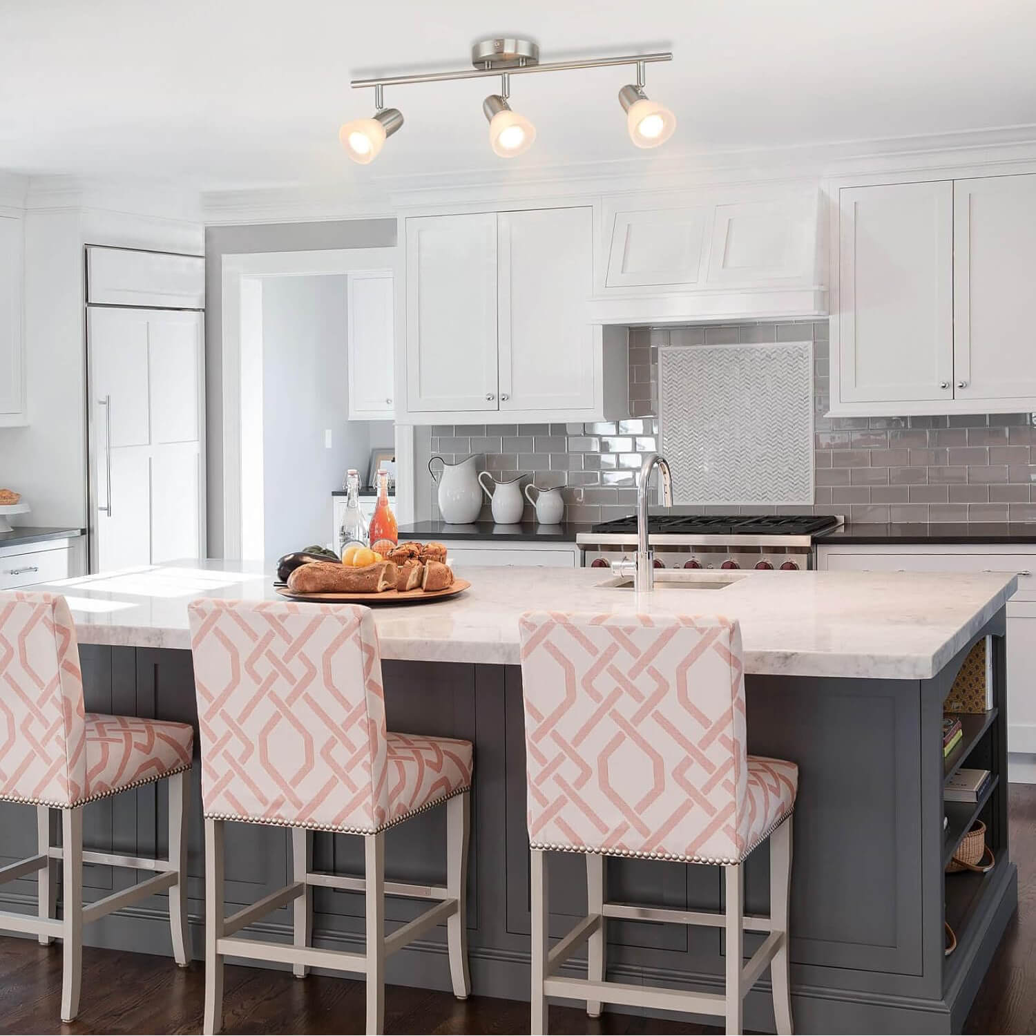 - MODERN DESIGN: Track light with frosted glass and straight tube in brushed nickel finish take a fashionable, warm soft attractive atmosphere to your home. This 3 light kitchen ceiling light can be mounted as wall or ceiling track light that is perfect for kitchen, bathrooms, bedrooms, entryways, kitchen, dinning and living areas