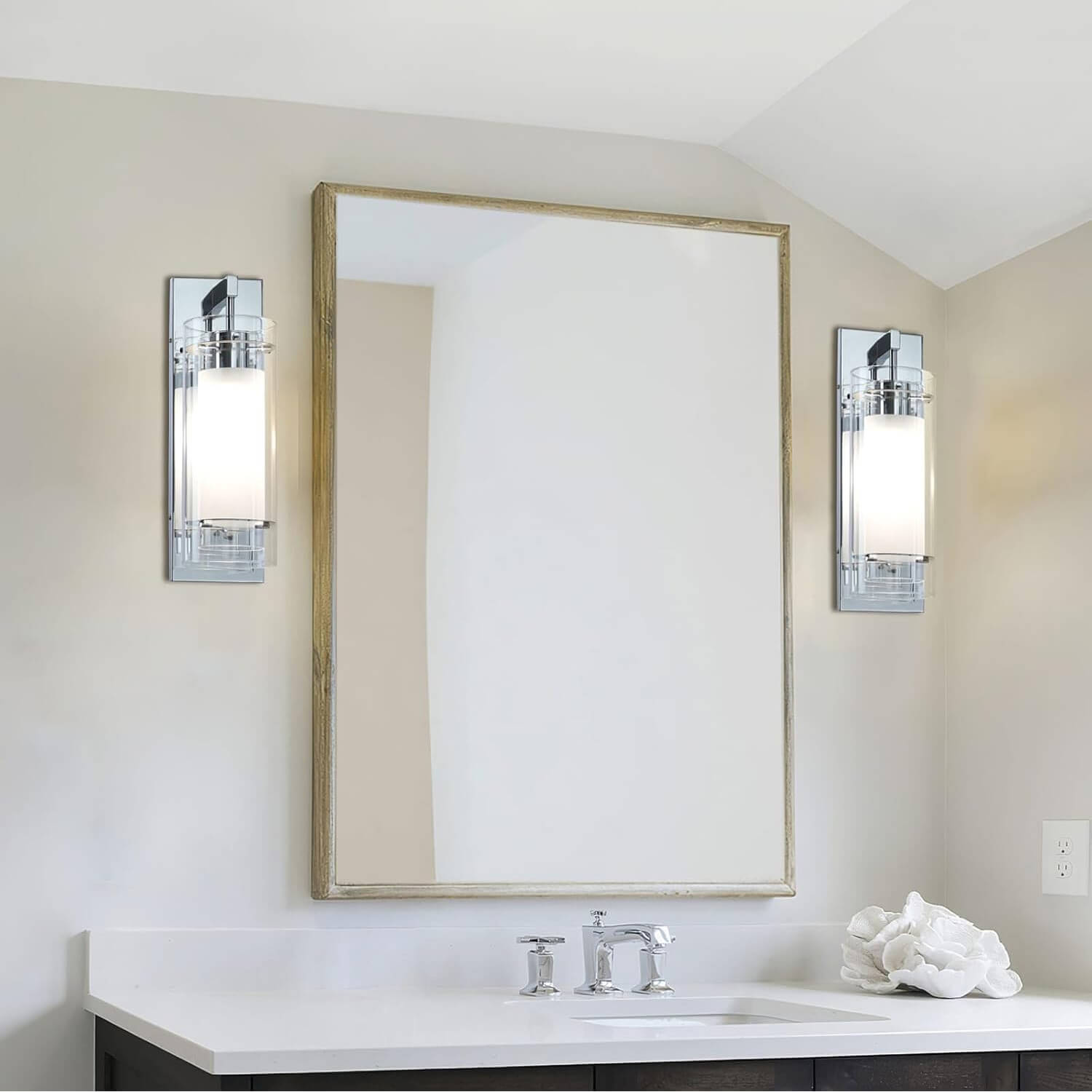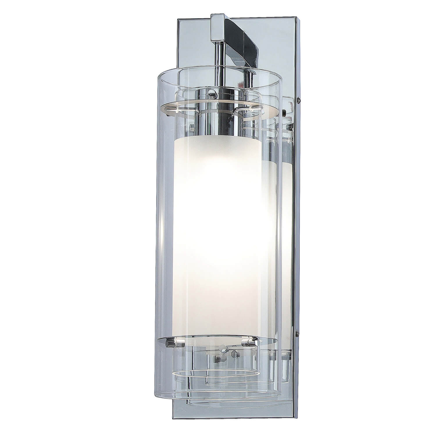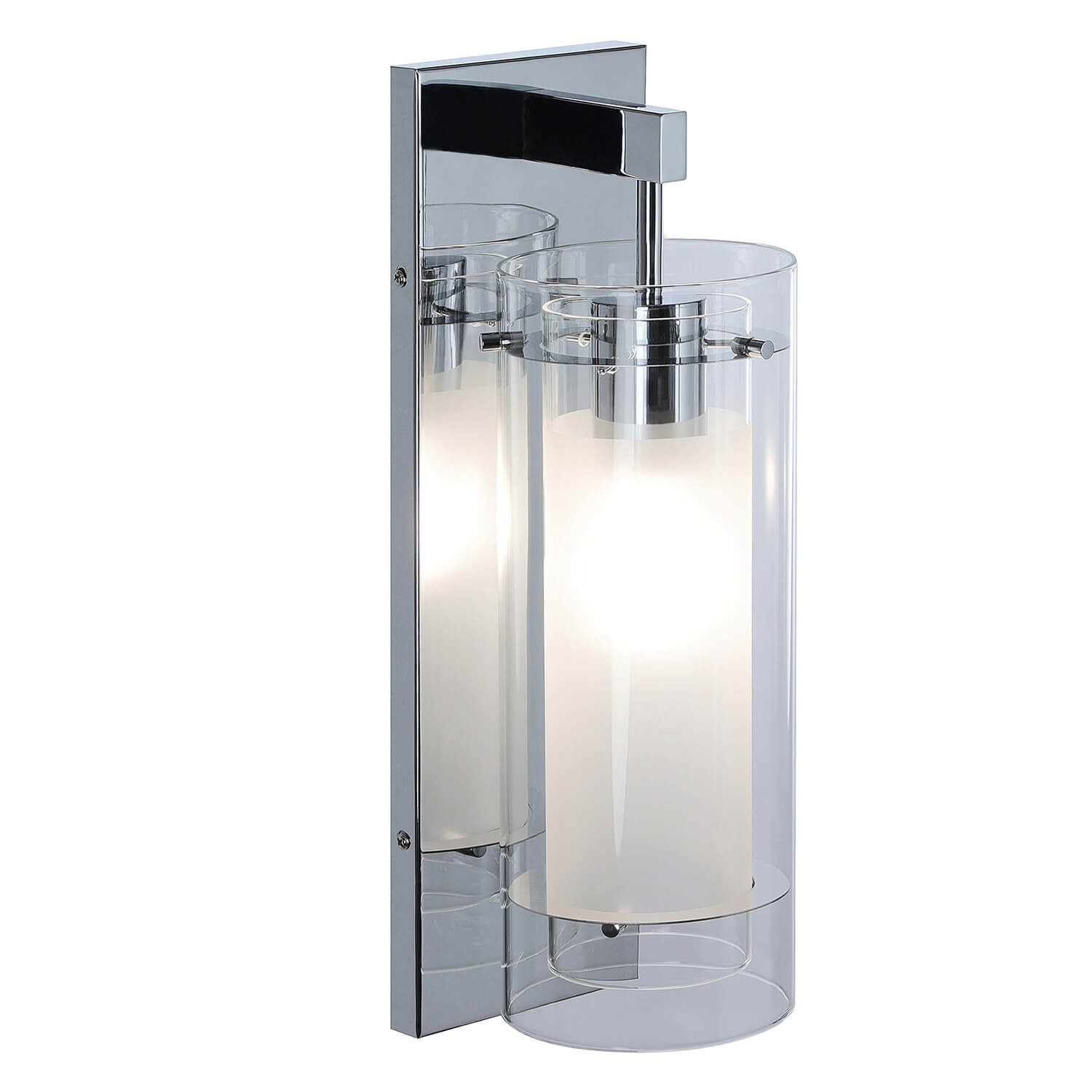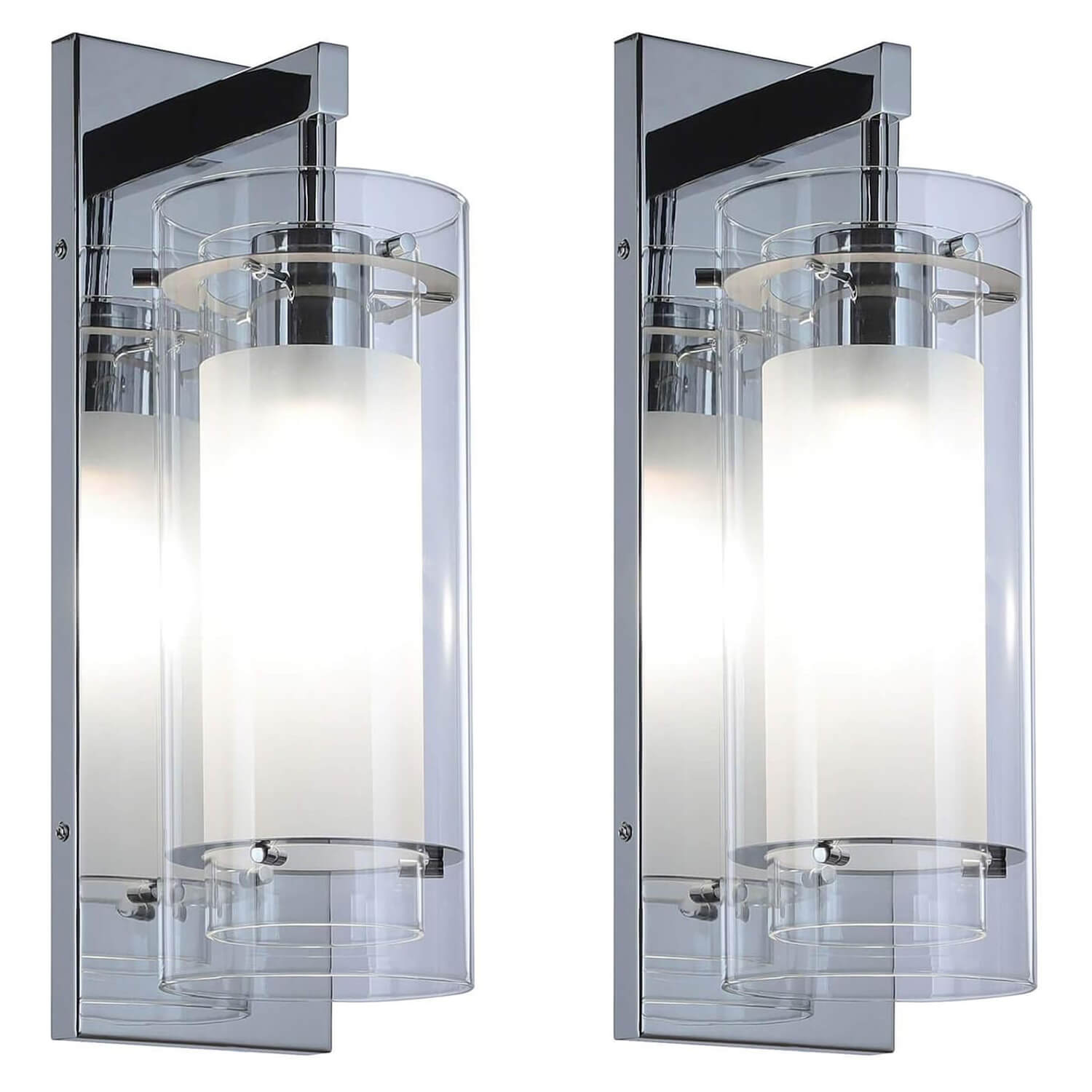- FEATURE: Hardwired, Chrome Wall Sconce light with unique 2-shade design featuring both a clear glass cylinder shade and frosted glass inner shade