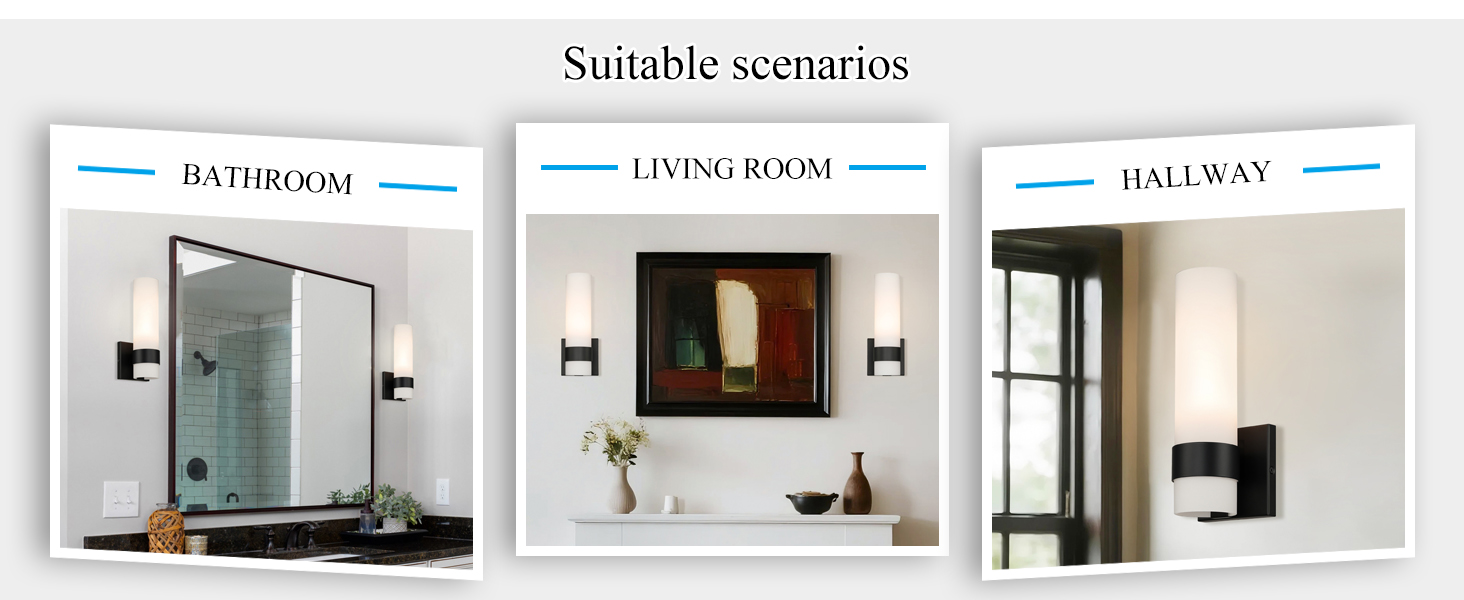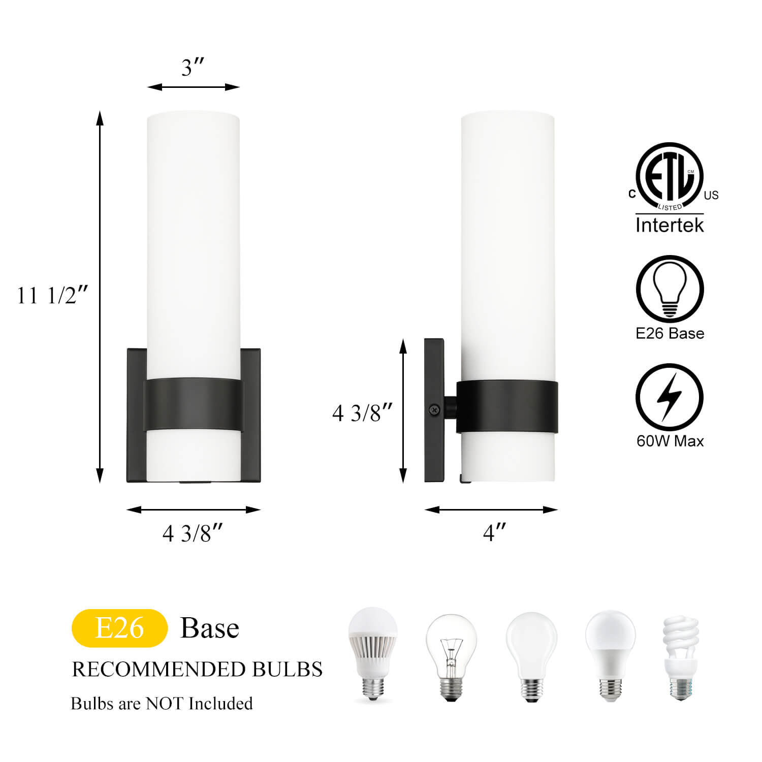 - MODERN DESIGN: Black wall sconce is made of solid metal that is strong and durable. Wall light fixtures with white tube glass can be perfectly bring a soft and comfortable feeling for your home lighting. This glass wall sconce is ideal as a hallway wall sconce, bedroom reading light or bathroom wall mount light.