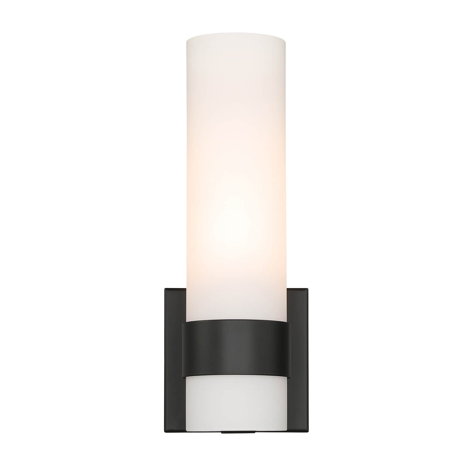 Wall sconce with white tube glass shade softly diffuses light for a warm and inviting glow. Its classic color contrasts elegantly with the black base, creating a timeless visual appeal.