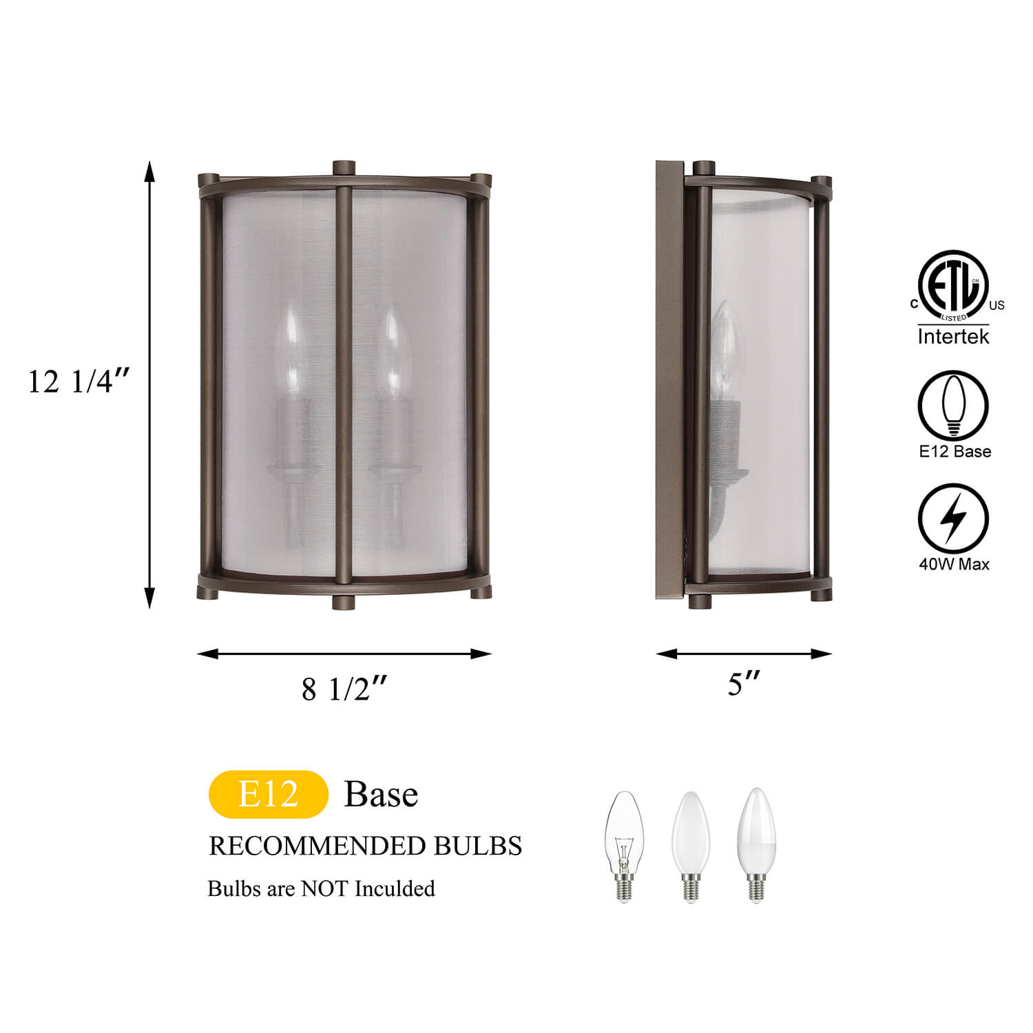 - CANDELABRA BASE SOCKET: This sconces wall lighting suggest to takes two maximum 40 watt Candelabra base bulbs (incandescent, CFL or LED compatible). Bulbs not included.