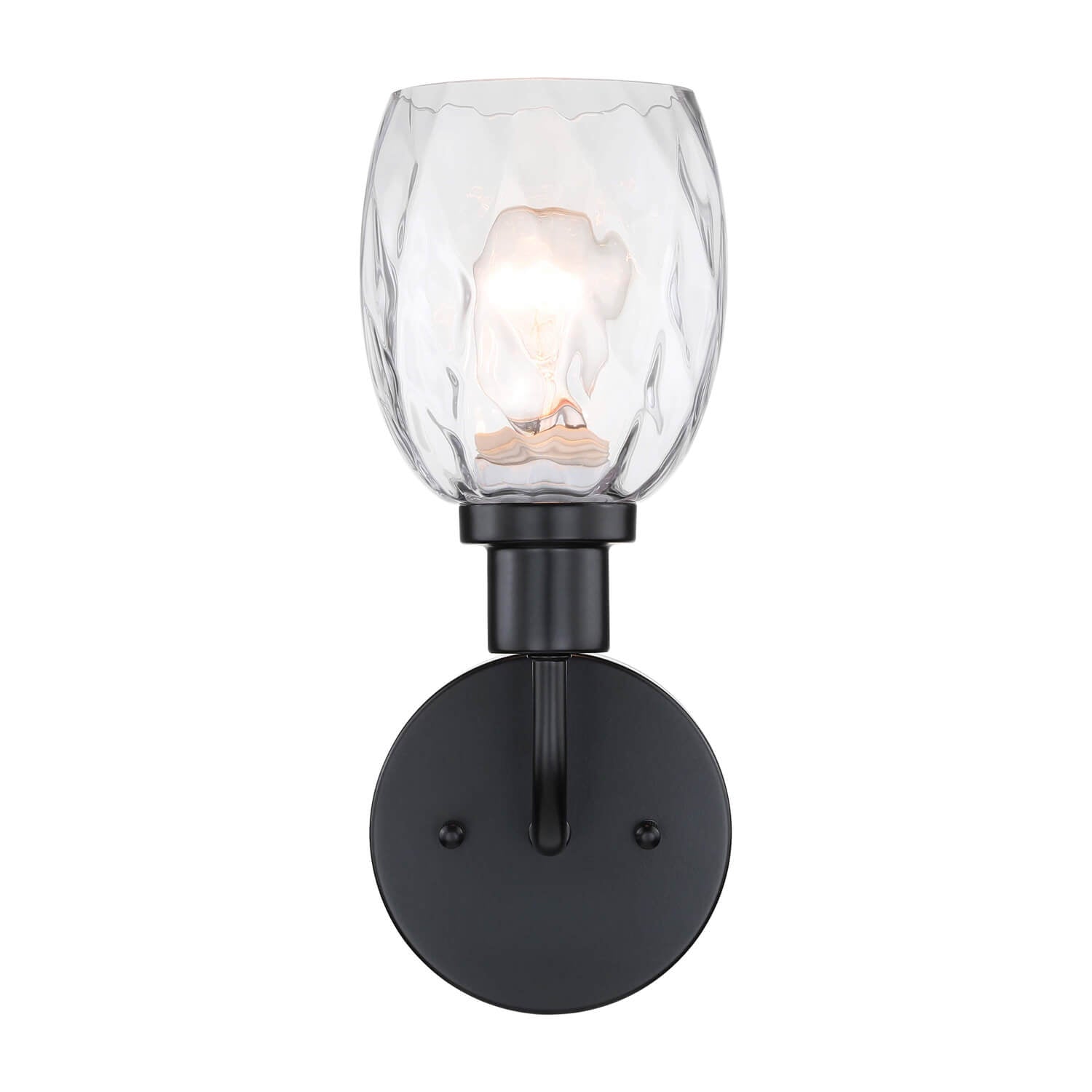 This 1 Light Wall light fixture is a hardwired product, that features a circle backplate and clear faceted glass in a matte black finish.