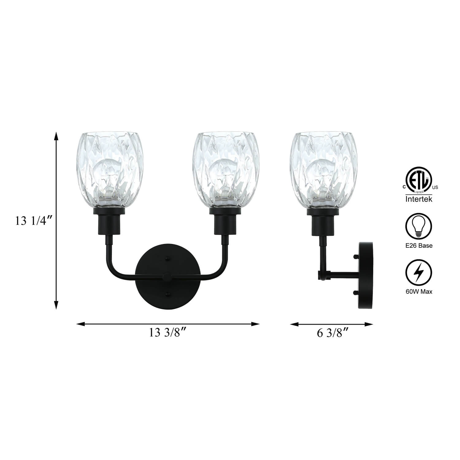 - MEDIUM BASE SOCKET:This black vanity light suggest to takes two maximum 60 watt Medium base bulbs (incandescent or LED compatible). Bulbs not included.