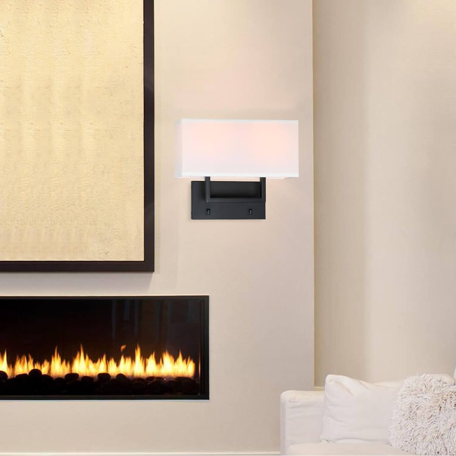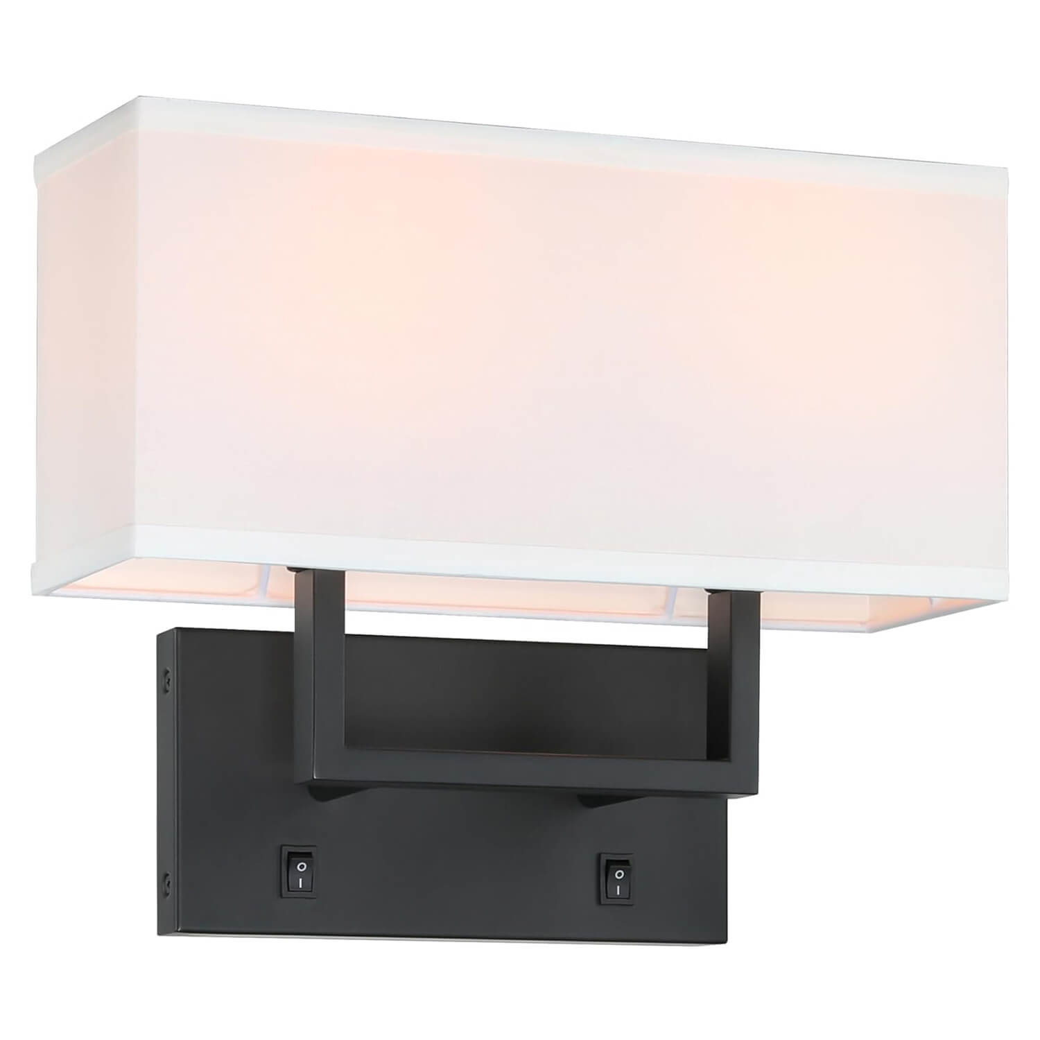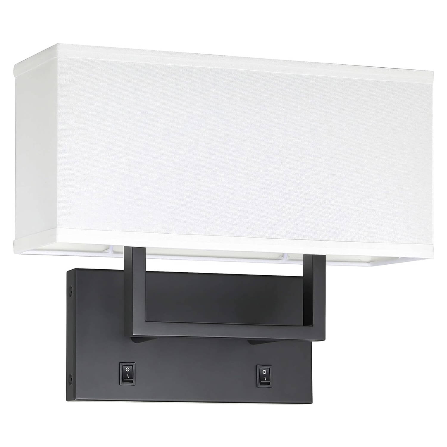- FEATURE: Wall lamp with black solid rectangular hardware backplate and tubular square arm and white fabric shade. There are 2pcs On/Off switch on the backplate that can control each light separately then makes reading at night so much better. Indoor wall mounted light with this white fabric shade casts a warm soft glow when lights on. The light radiates from the top and the bottom and the effect looks beautiful as a wall wash.