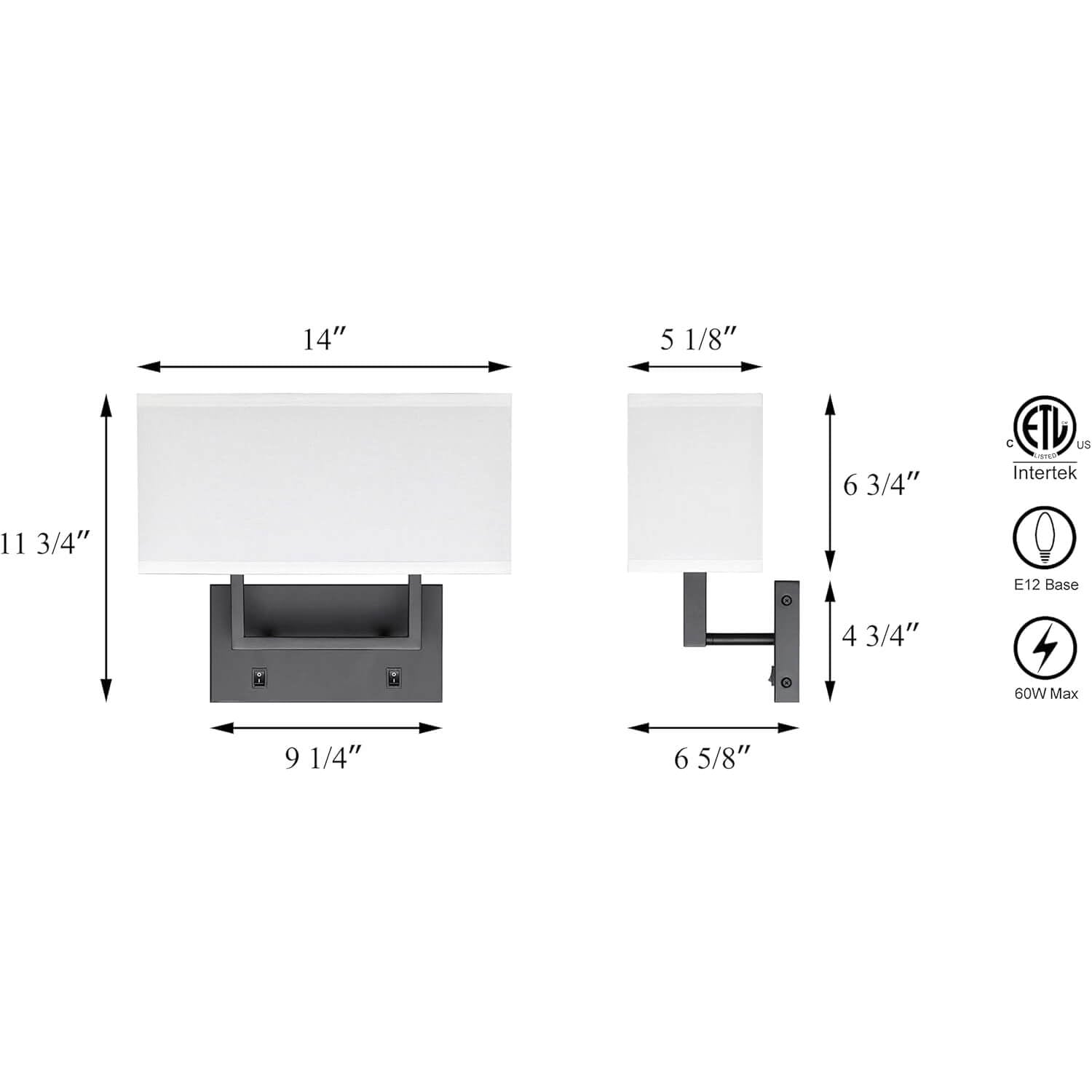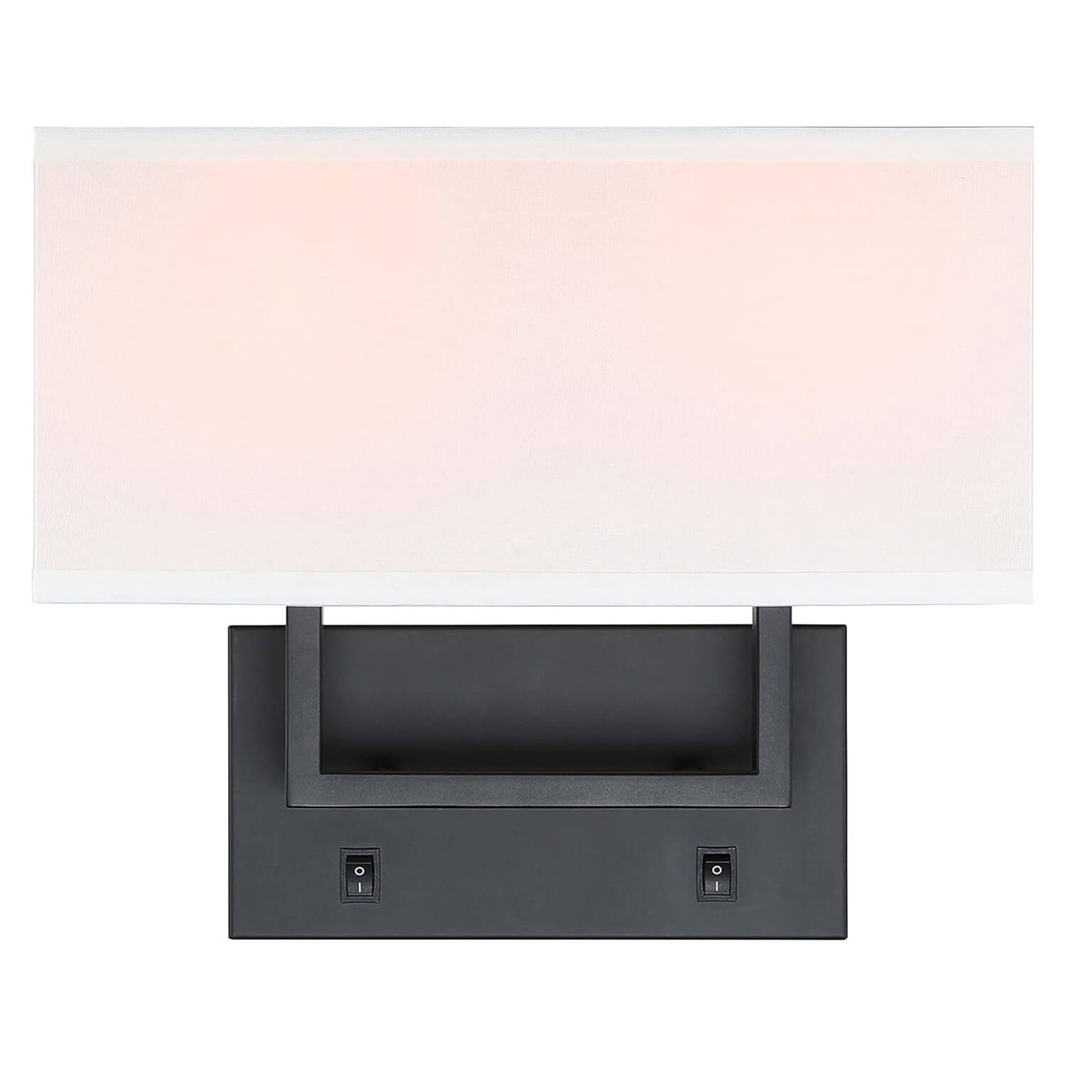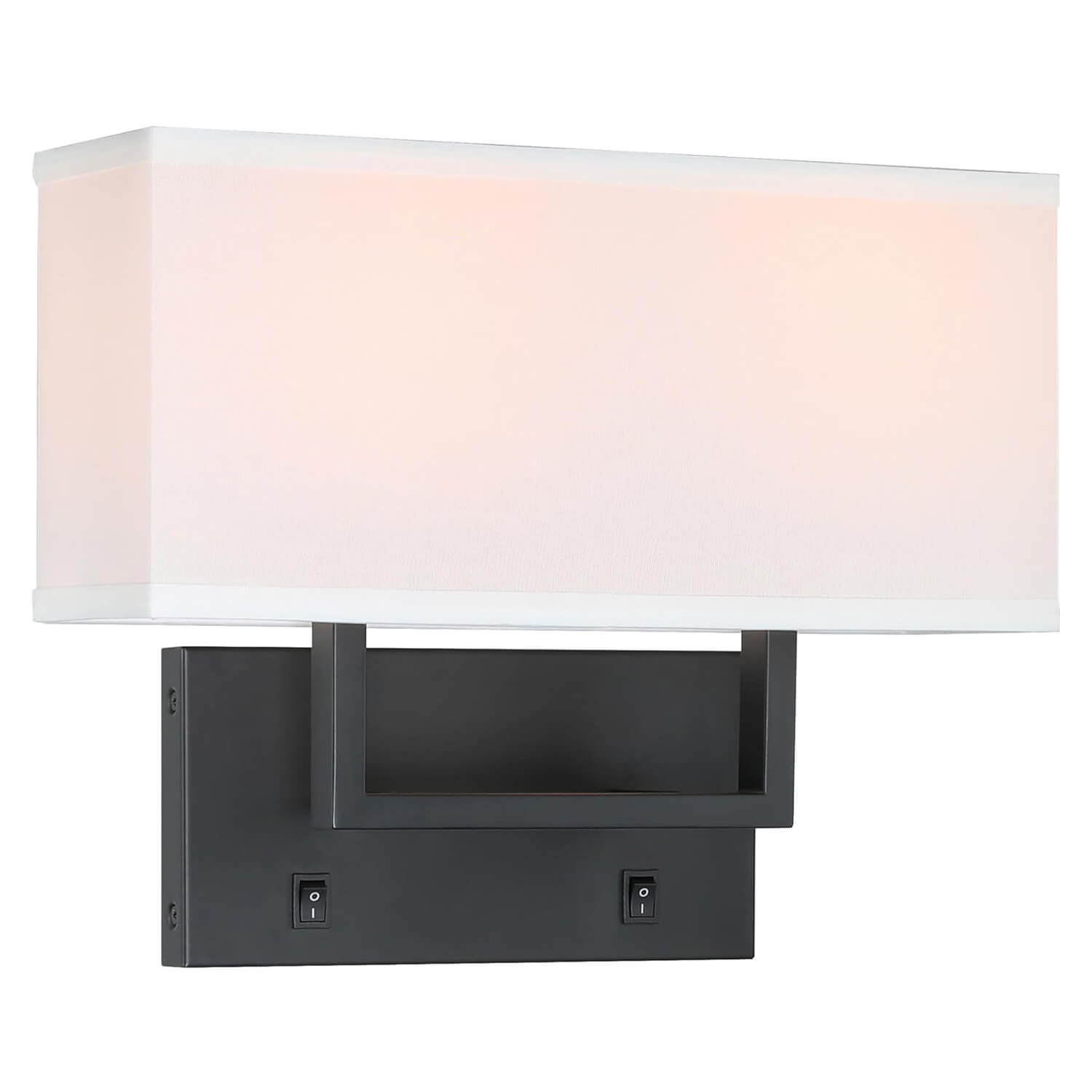 - FEATURE: Wall lamp with black solid rectangular hardware backplate and tubular square arm and white fabric shade. There are 2pcs On/Off switch on the backplate that can control each light separately then makes reading at night so much better. Indoor wall mounted light with this white fabric shade casts a warm soft glow when lights on. The light radiates from the top and the bottom and the effect looks beautiful as a wall wash.