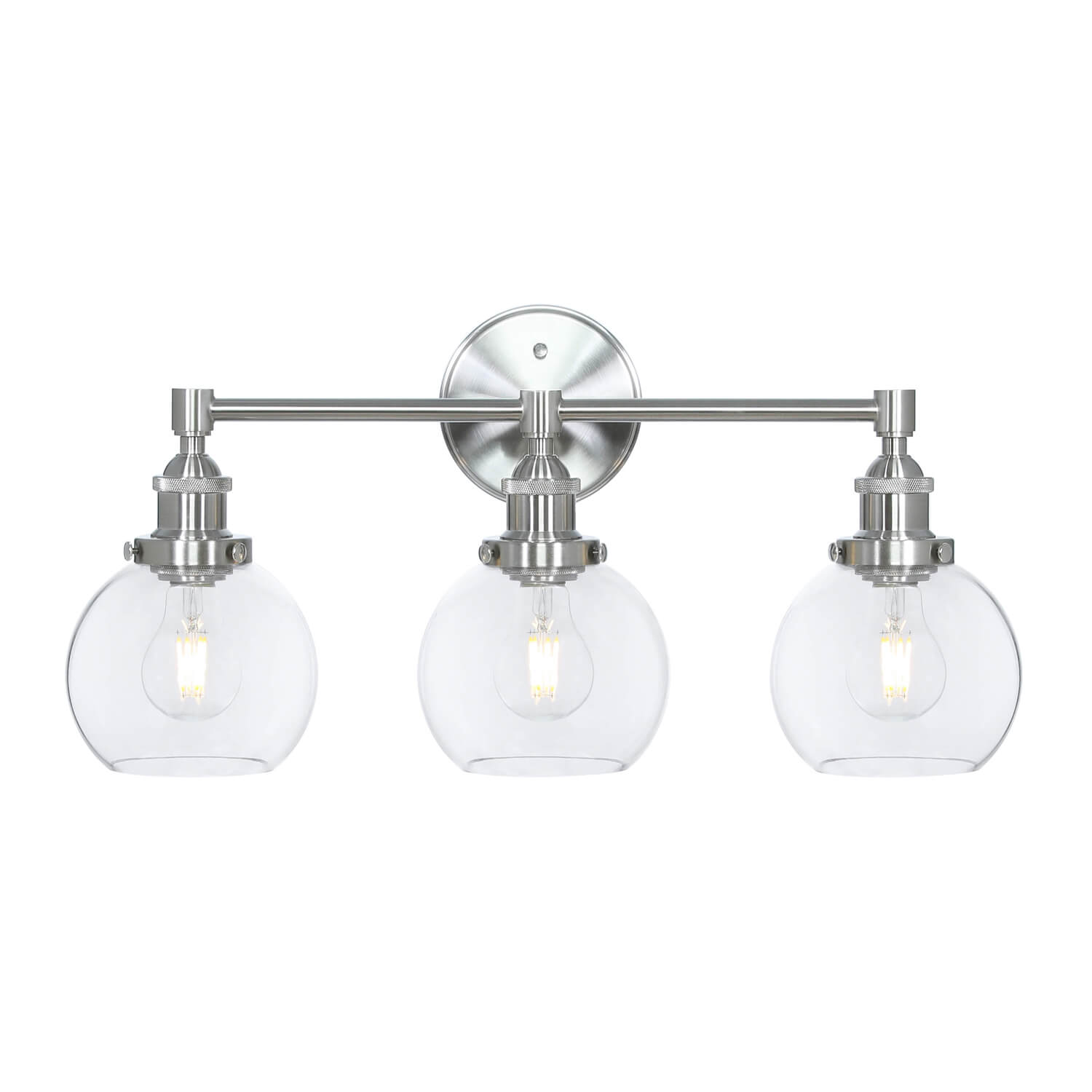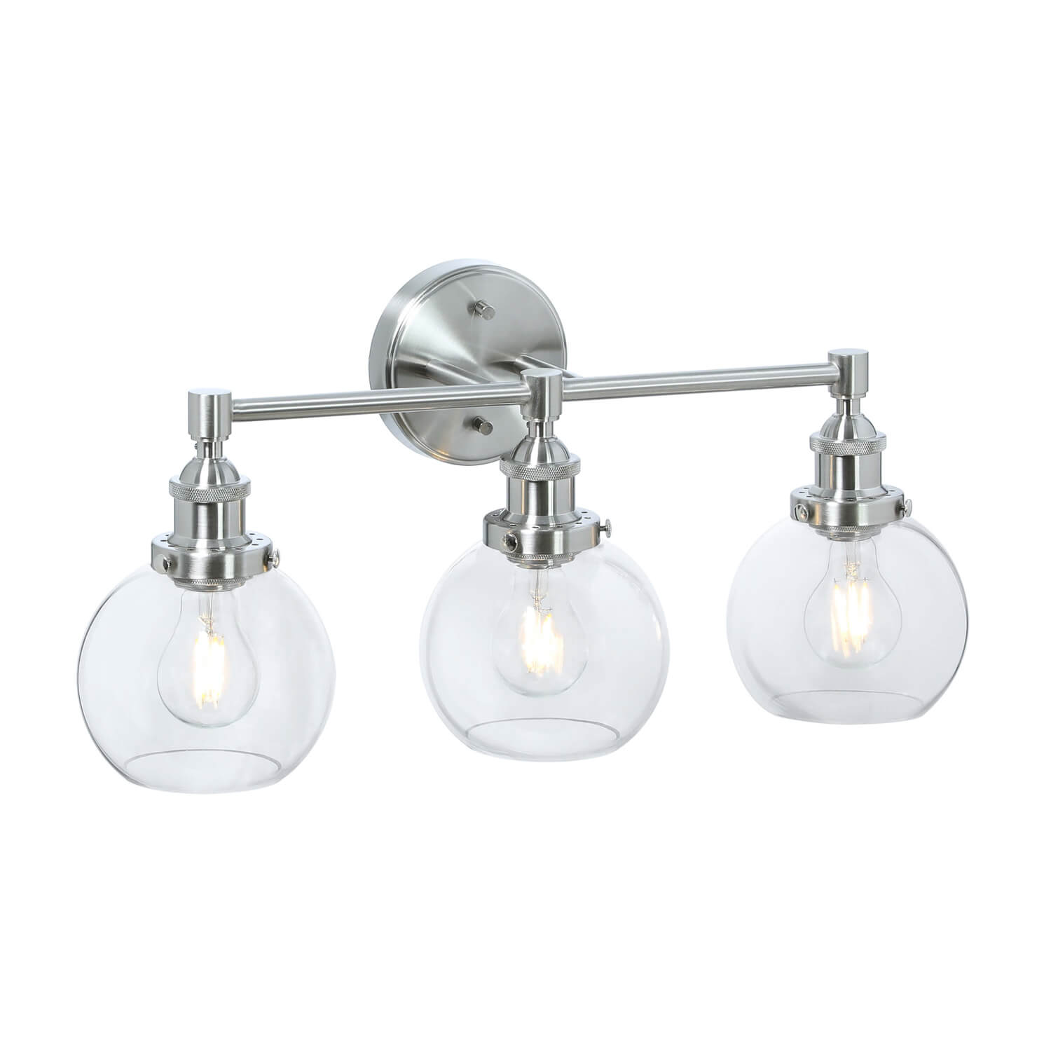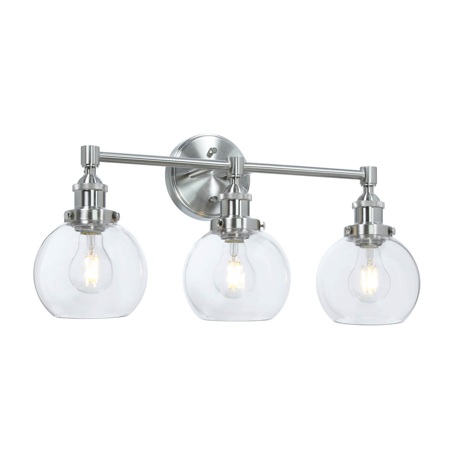 This 3 Light bathroom vanity light fixtures feature a clear, spherical shade paired with vintage style metal fittings in stylish brushed nickel finishes.