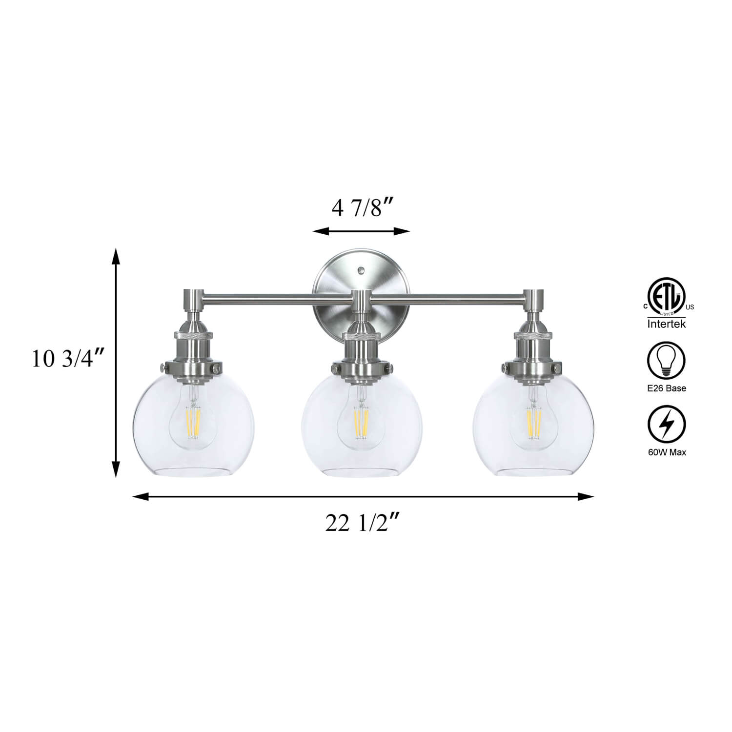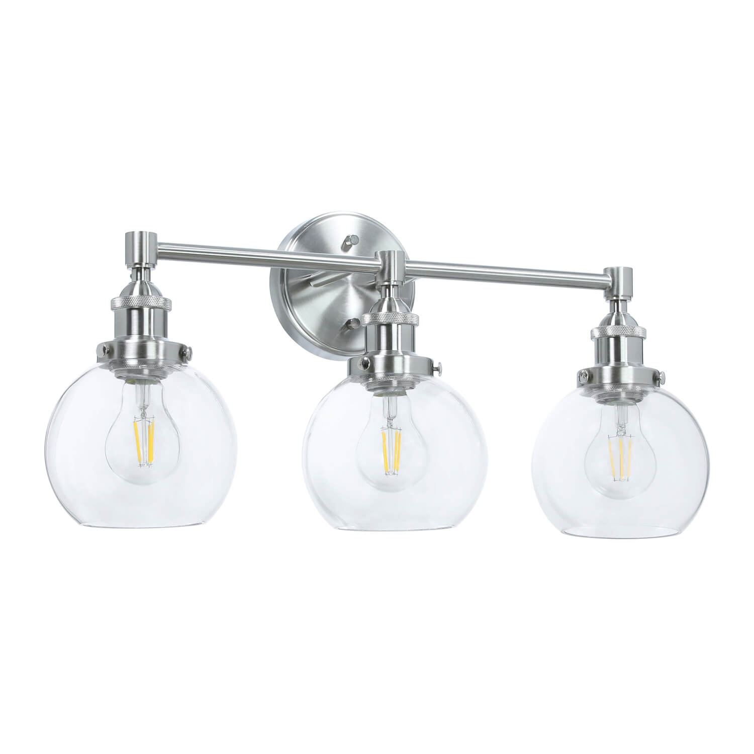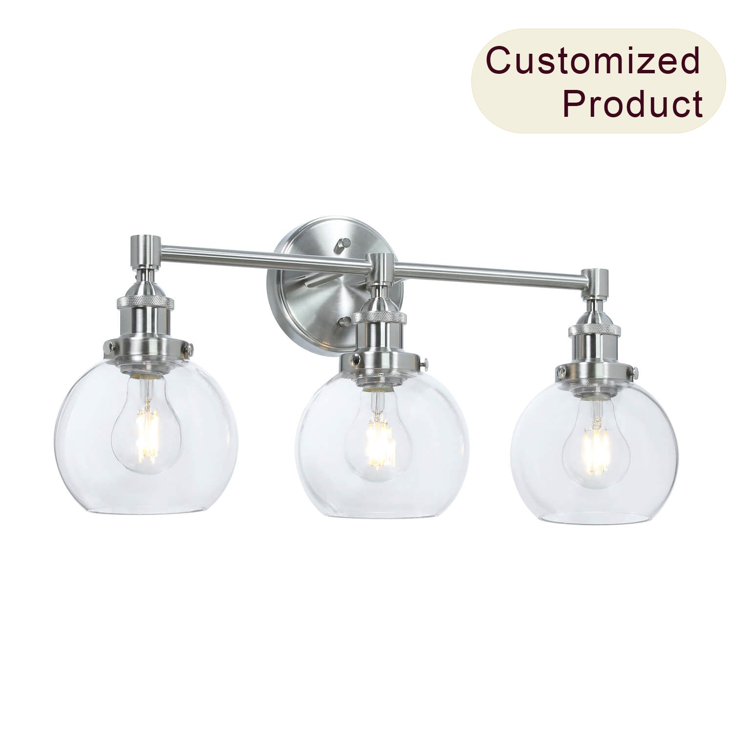- VINTAGE DESIGN: This 3 light batrhoom vanity light is equipped with clear glass globe shades that showcase the bulb your choose. Ideal for top side of a mirror or bed, a doorway or entryway, lining an office or hotel hallway.